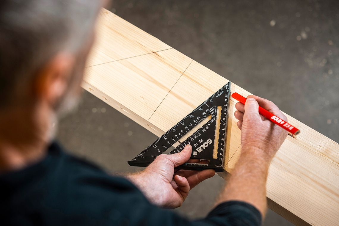 Kątownik posiada kąt 45°, który można szybko zaznaczyć. W tym celu kątownik umieszcza się krawędzią T na krokwi lub elemencie obrabianym i zaznacza linię wzdłuż dłuższego boku kątownika. Jeśli kąt 45° ma przebiegać w innym kierunku, kątownik jest po prostu odwracany.