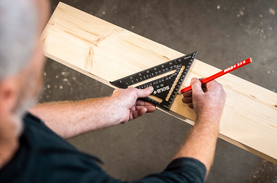 Kątownik idealnie nadaje się do oznaczania kątów 90° lub sprawdzania, czy krawędź jest kątem prostym. W celu oznaczenia kąta prostego, kątownik jest umieszczany krawędzią T na krokwi lub elemencie obrabianym, a linia 90° jest rysowana prostopadle do krawędzi T wzdłuż krawędzi znakującej.