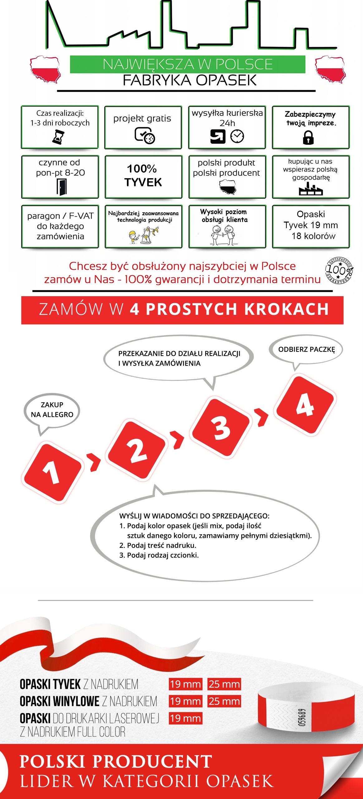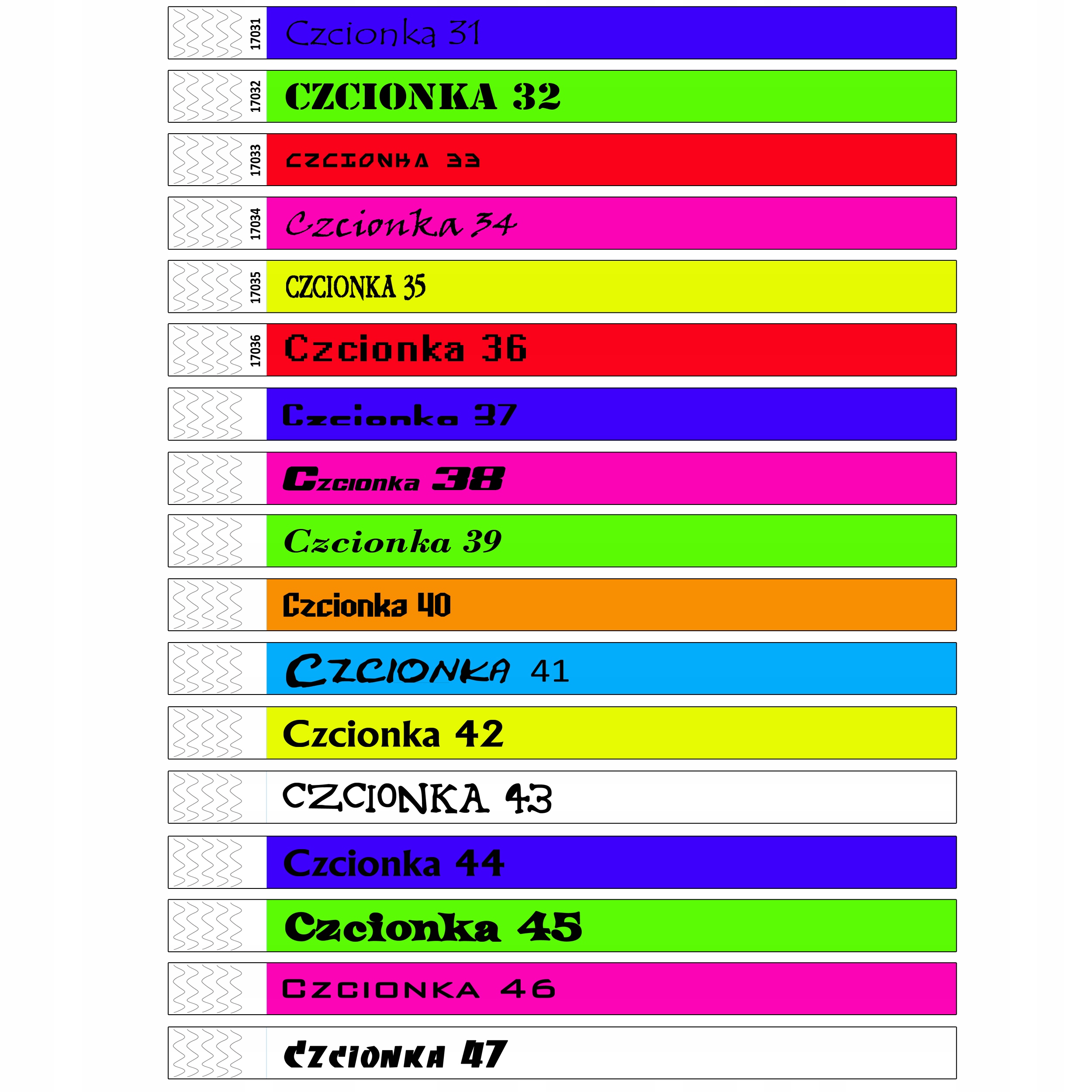 Mamy do zaoferowania Państwu opaski Tyvek 19 x 255mm w 18 różnych kolorach. Nadruk w kolorze złotym najlepiej wychodzi na ciemnych kolorach opasek. Na jasnych(neonowych) kolorach jest niewidoczny.
