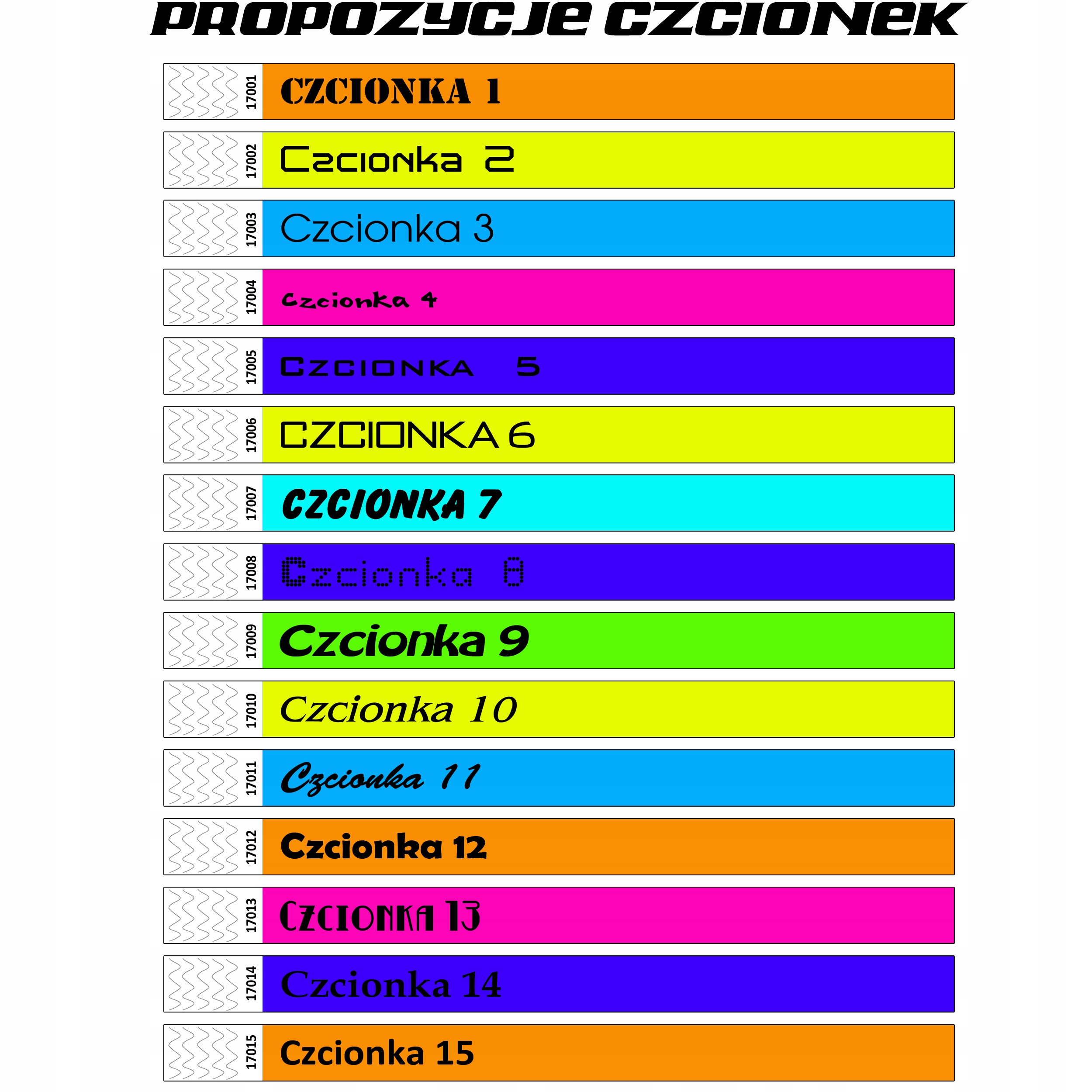 Z poniższych szablonów proszę wybrać czcionkę która Państwa interesuje. W wiadomości dla sprzedającego proszę napisać numer czcionki, kolor opasek oraz treść nadruku jaka ma być umieszczona na opaskach + ewentualne logo proszę przesłać na naszego maila.