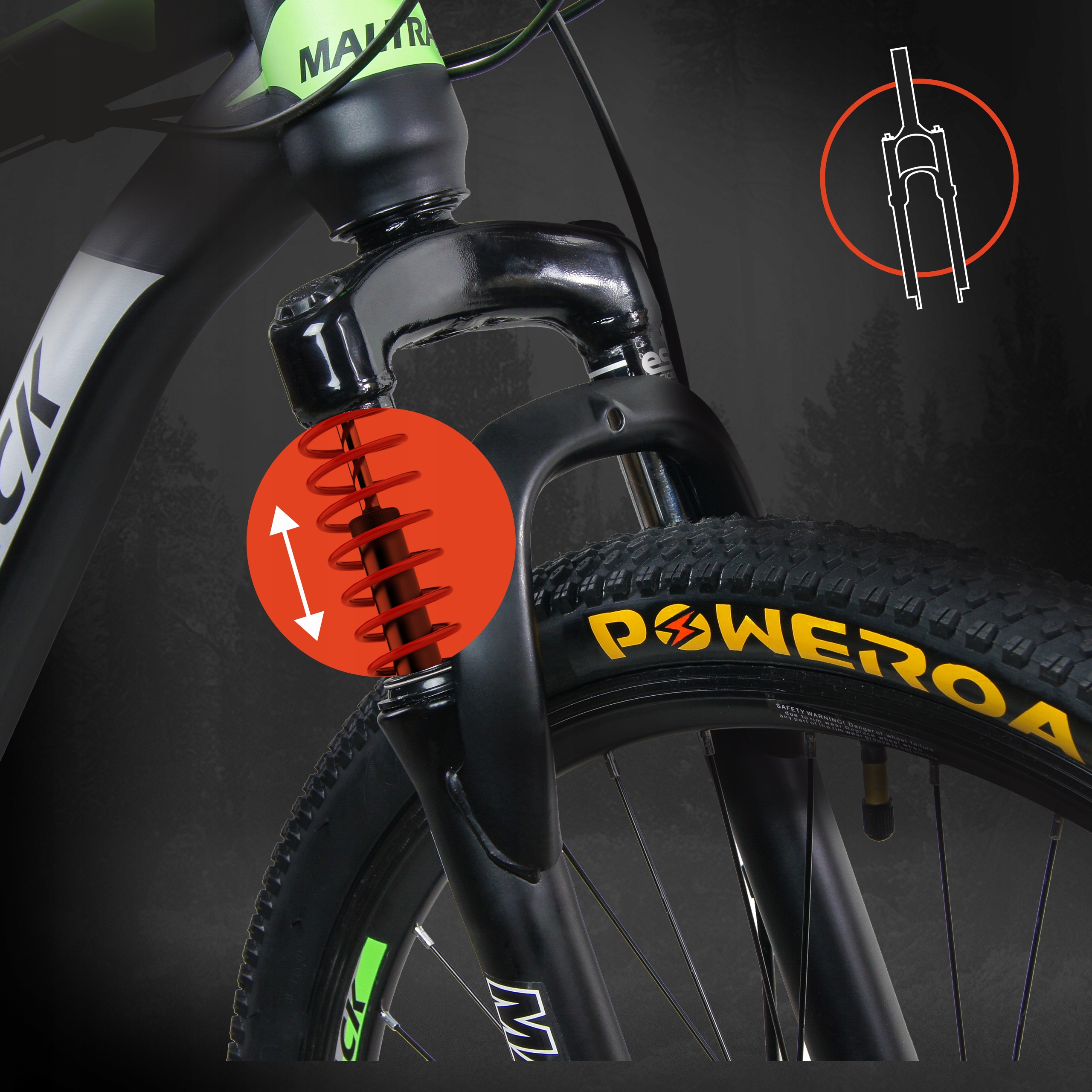 Дисковые тормоза полностью отличаются от классических V-тормозов. Они гораздо эффективнее и прочнее не портят при этом обода колес. Сила, действующая на щит это значительно увеличивает длину тормозного пути. Чрезвычайно полезно для местности горы, где мы часто сталкиваемся с ситуациями внезапного торможения.