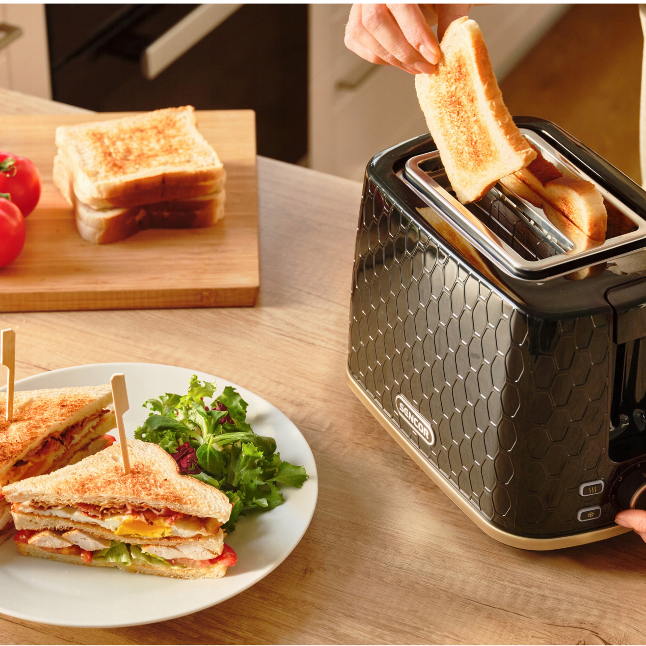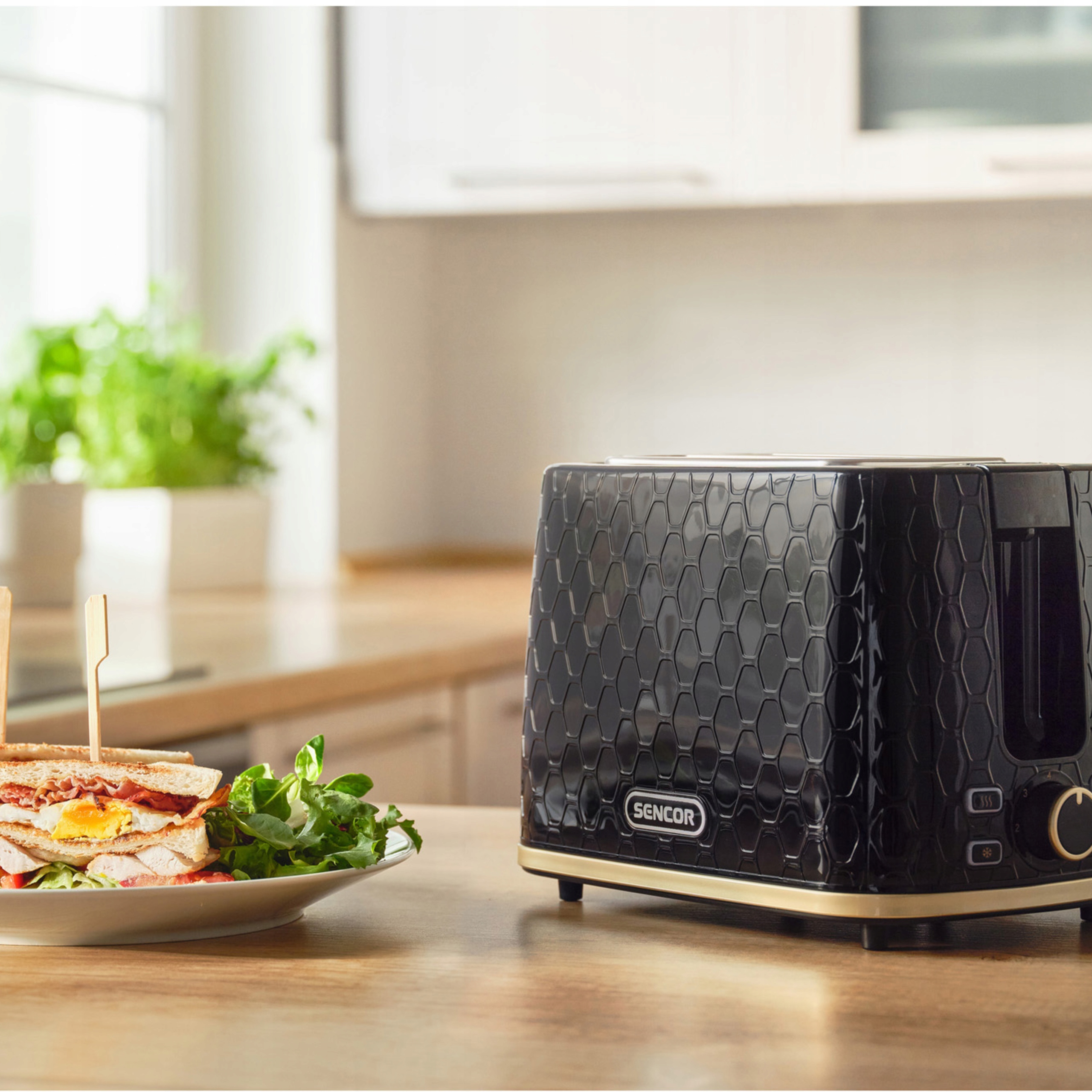 Oferowany przez nas toster STS 7201BK marki Sencor będzie nie tylko robił nam pyszne, chrupkie tosty. Dzięki eleganckiej obudowie o strukturze plastra miodu, urządzenie to może stanowić idealną ozdobę w kuchni, jednakowo urządzonej tradycyjnie, jak i w nowoczesnym stylu.