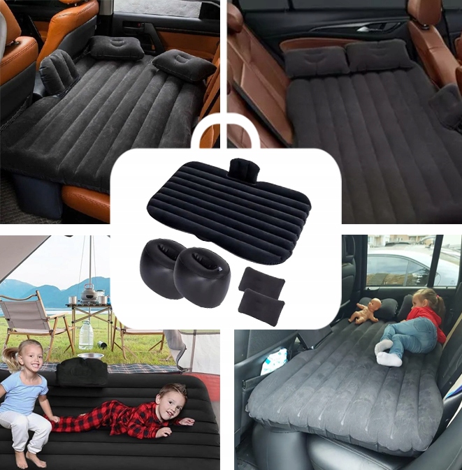 ⭐Zestaw został opakowany w wygodną torbę, w niej znajdziesz:materac, dwie poduszki, dwie poduchy do przestrzeni między kanapą, a przednimi siedzeniami, samochodową pompkę z 3 końcówkami oraz zestaw naprawczy.