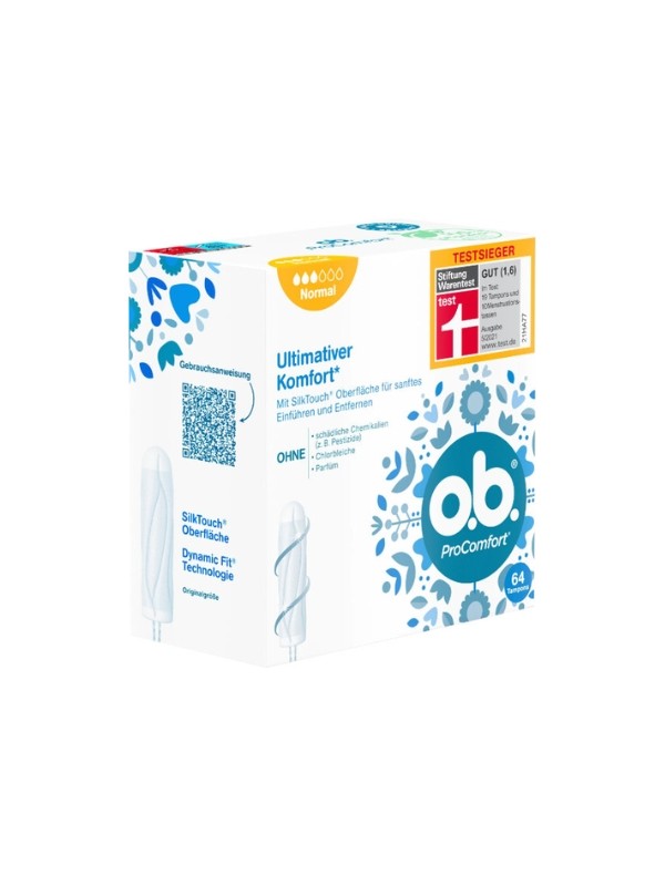 Tampony o.b.® ProComfort to produkt, który zapewnia najwyższy komfort podczas okresu. Ich powierzchnia SilkTouch sprawia, że są łatwe do zakładania i zdejmowania. Dzięki technologii Dynamic Fit doskonale dopasowują się do kształtu ciała, a rowki na tamponie pomagają skutecznie rozprowadzić płyn wewnątrz. Tampony te zawierają w 100% roślinne rdzenie tamponowe, nie zawierają szkodliwych substancji chemicznych, takich jak pestycydy, wybielacze chlorowe czy perfumy. Przeszły również testy ginekologiczne. Produkt zawiera tworzywo sztuczne, dlatego po użyciu nie powinien być wyrzucany do toalety, lecz do kosza na śmieci, co wspomaga ochronę środowiska naturalnego.