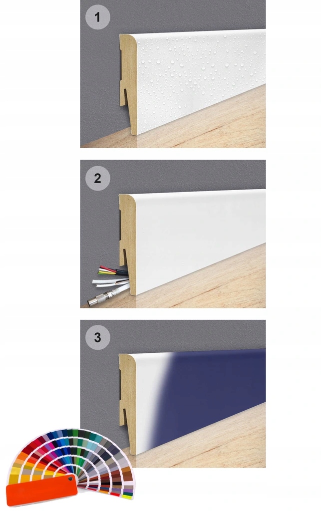 1. Listwy wykonane są z materiału MDF i pokryte okleiną, która jest w pełni wodoodporna i przystosowana do mycia.