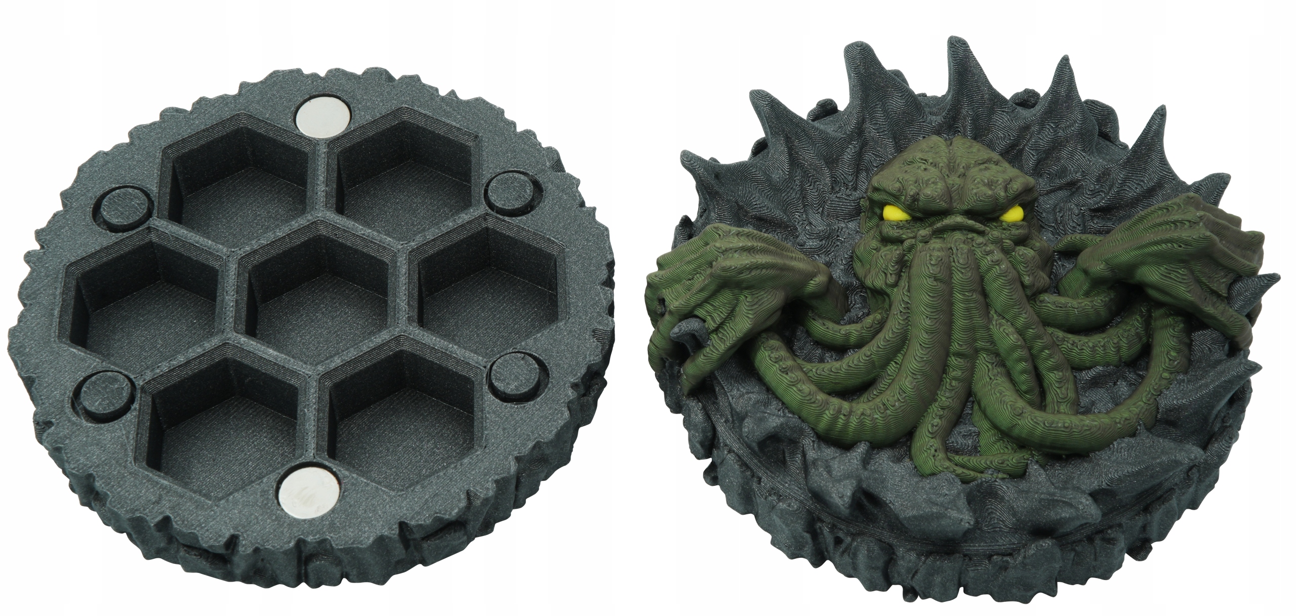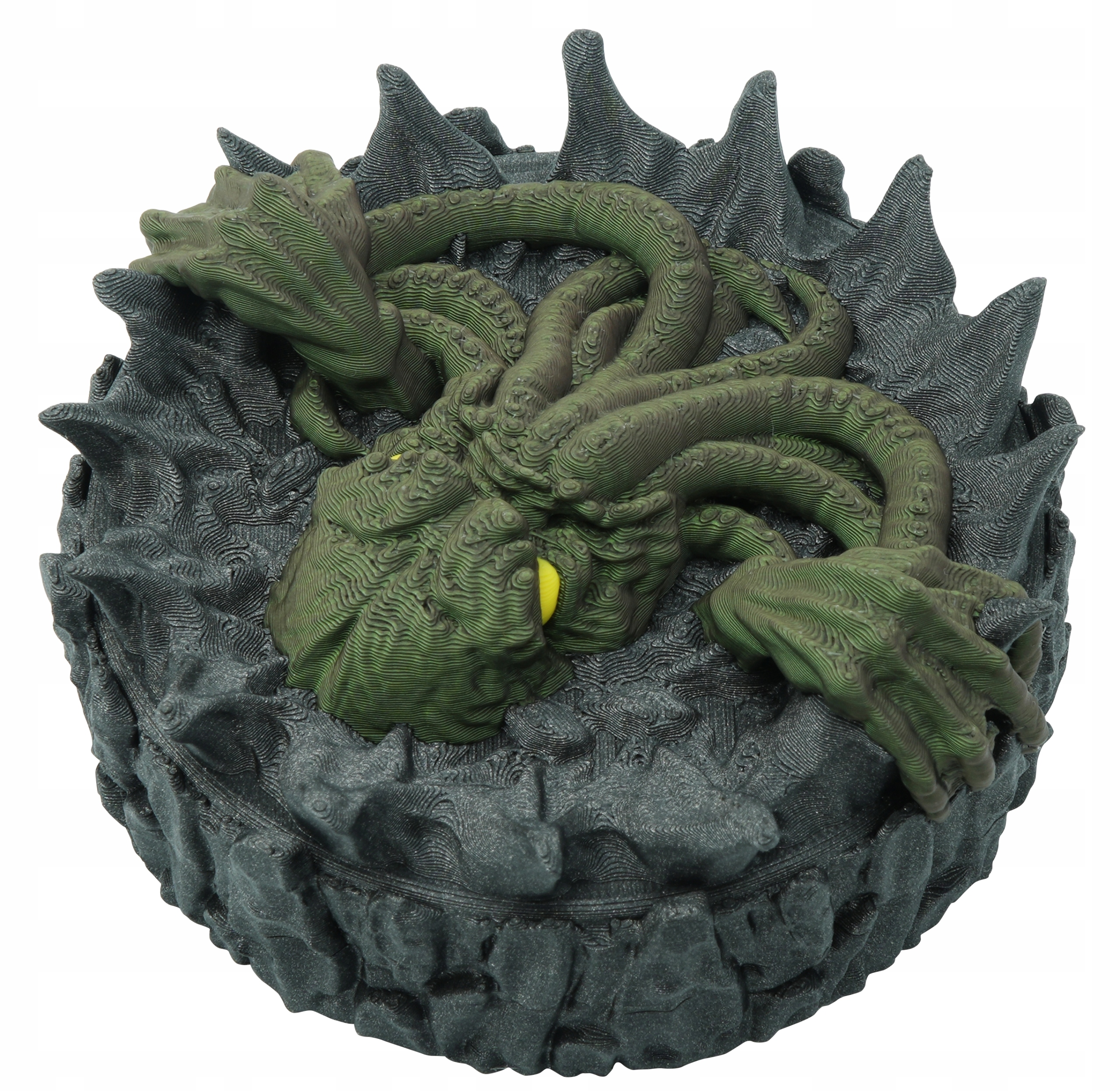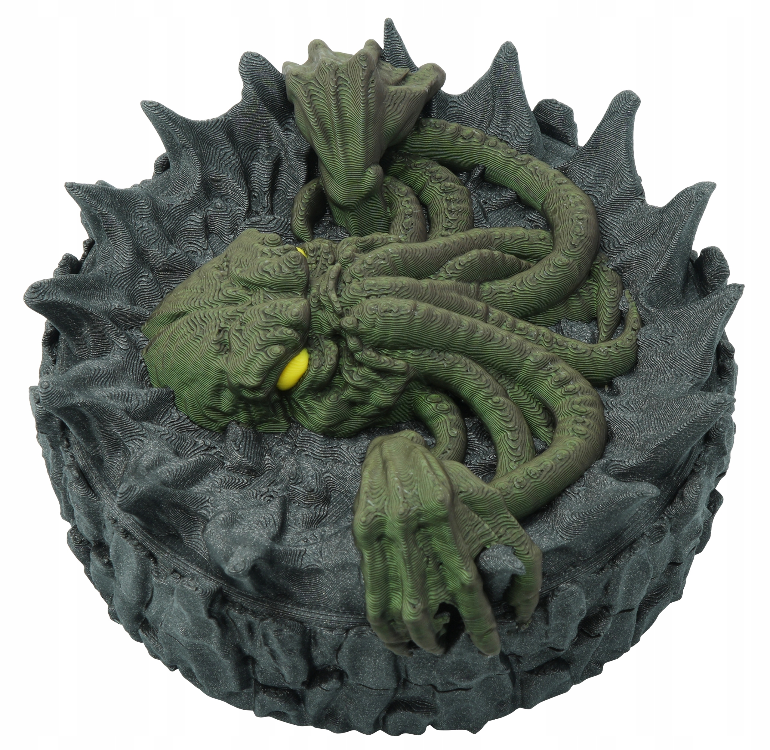 Название Cthulhu - magnetyczny pojemnik na kości RPG - pudełko/ogranizer/etui - czarny z zielonym cthulhu z żółtymi oczami