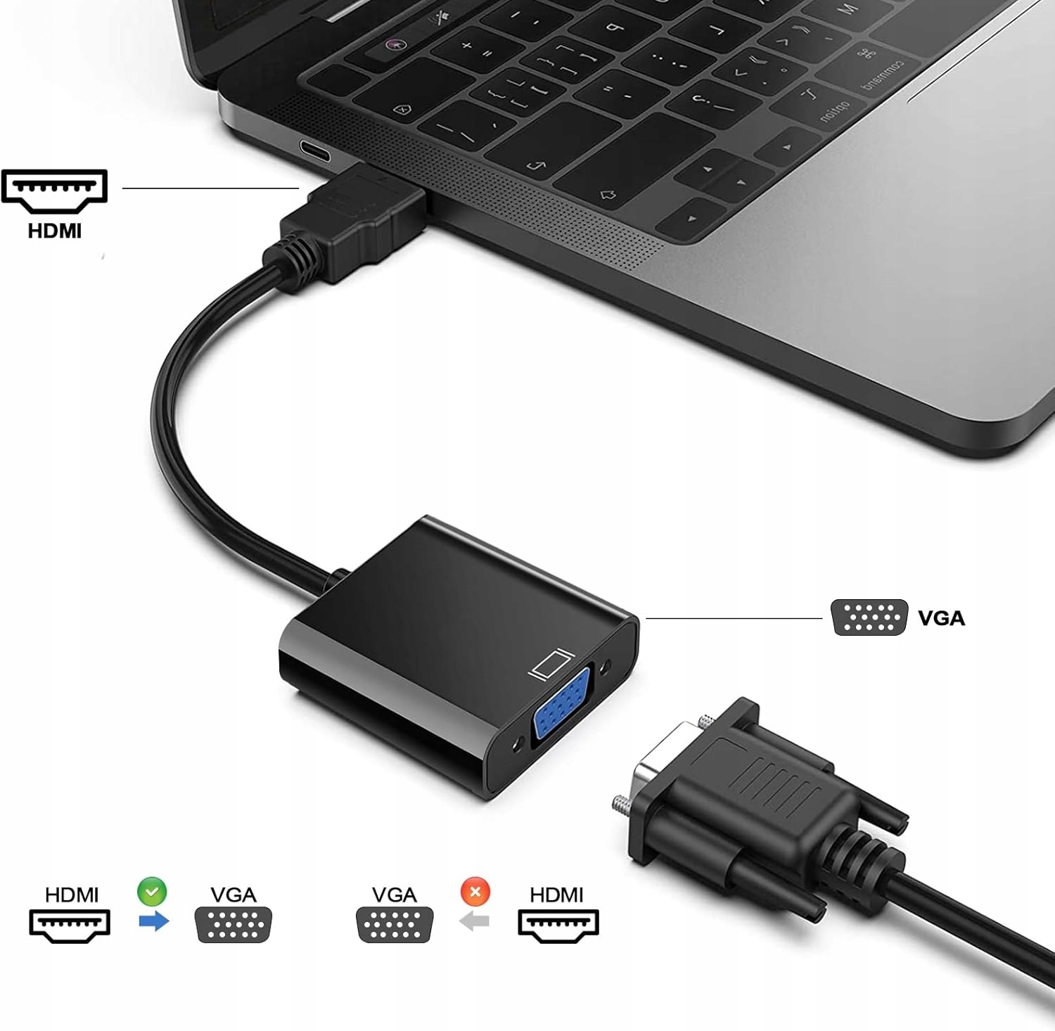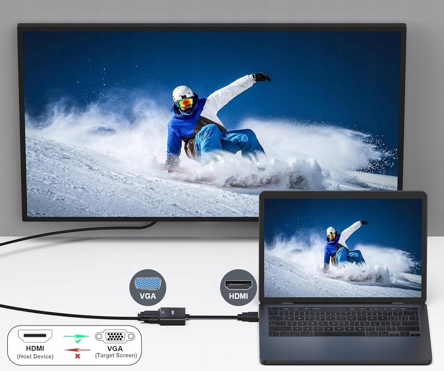 Idealne rozwiązanie do podłączenia nowoczesnych urządzeń wyposażonych w port HDMI do starszych monitorów, projektorów lub telewizorów z wejściem VGA.