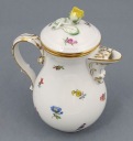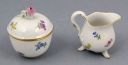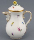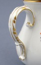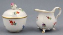 składający się z dzbanka, mlecznika, cukiernicy i sześciu filiżanek z podstawkami. Każdy z elementów z pofalowanym, złoconym rantem kołnierza, a także złoconymi uchwytami przy filiżankach, mleczniku i dzbanku. Na brzuścach wszystkich elementów i w lustrze talerzyków malowane delikatne kwiatki. Dzbanek z szeroką wylewką, rocaillowym uchwytem i wyobloną przykrywką z różyczką na szczycie.