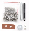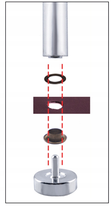 Zestaw dzięki któremu w łatwy sposób wytniesz otwór i zamontujesz oczka kaletnicze do materiału. Prezentowany zestaw składa się z trzech metalowych części: