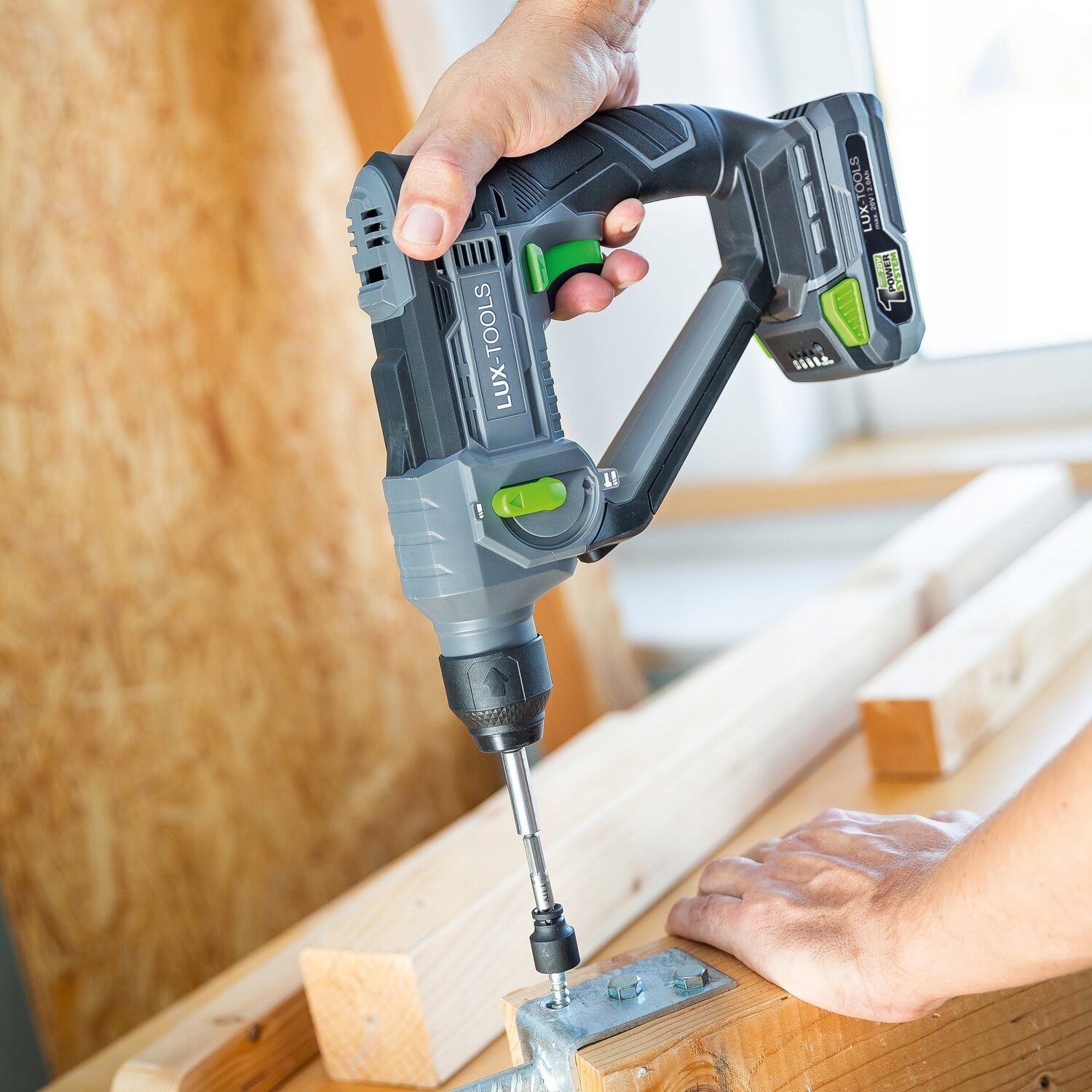 Перфоратор Lux Tools с напряжением батареи 20 в, силой удара 1,1 Дж и скоростью вращения 900 об / мин. Молоток отличается 3 функциями: завинчивание, сверление и ударное сверление. Устройство он найдет свое применение в ремеслах, домашних и ремонтных работах. Молот является частью Lux 1 PowerSystem и может питаться от высококачественных аккумуляторов литий-ионные 20В этой серии. Питание от батареи обеспечивает большую свободу передвижения и гибкость.