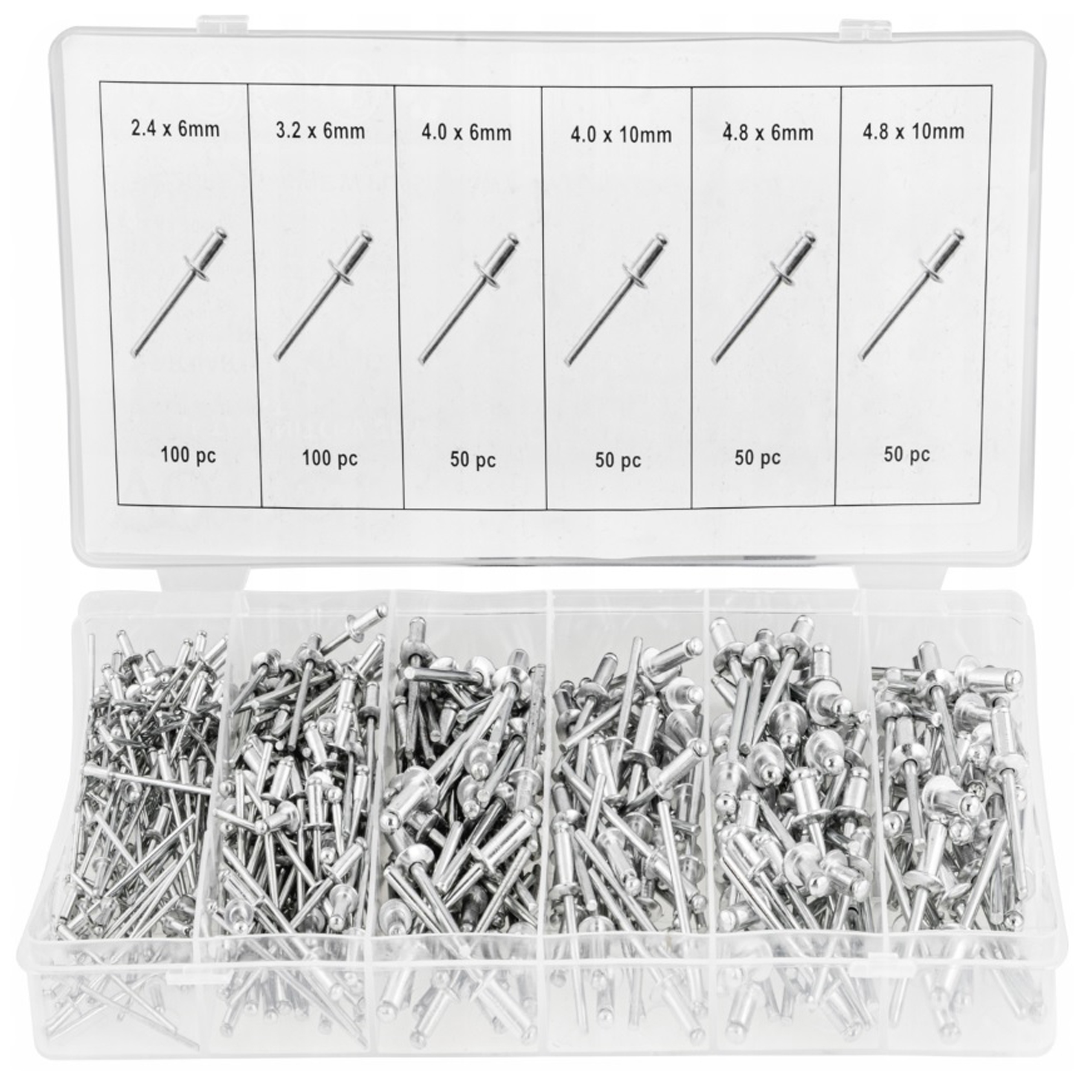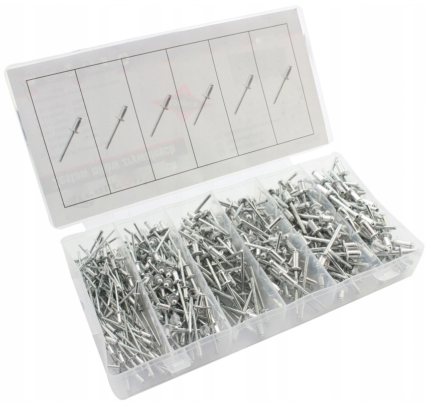 ✅Uniwersalny zestaw nitów zrywalnych używany przy nitowaniu. Całość umieszczona w poręcznym pudełeczku z przegrodami podzielonymi na rozmiary. Każda przegroda ma wypisane rozmiary jakie w sobie zawiera.