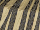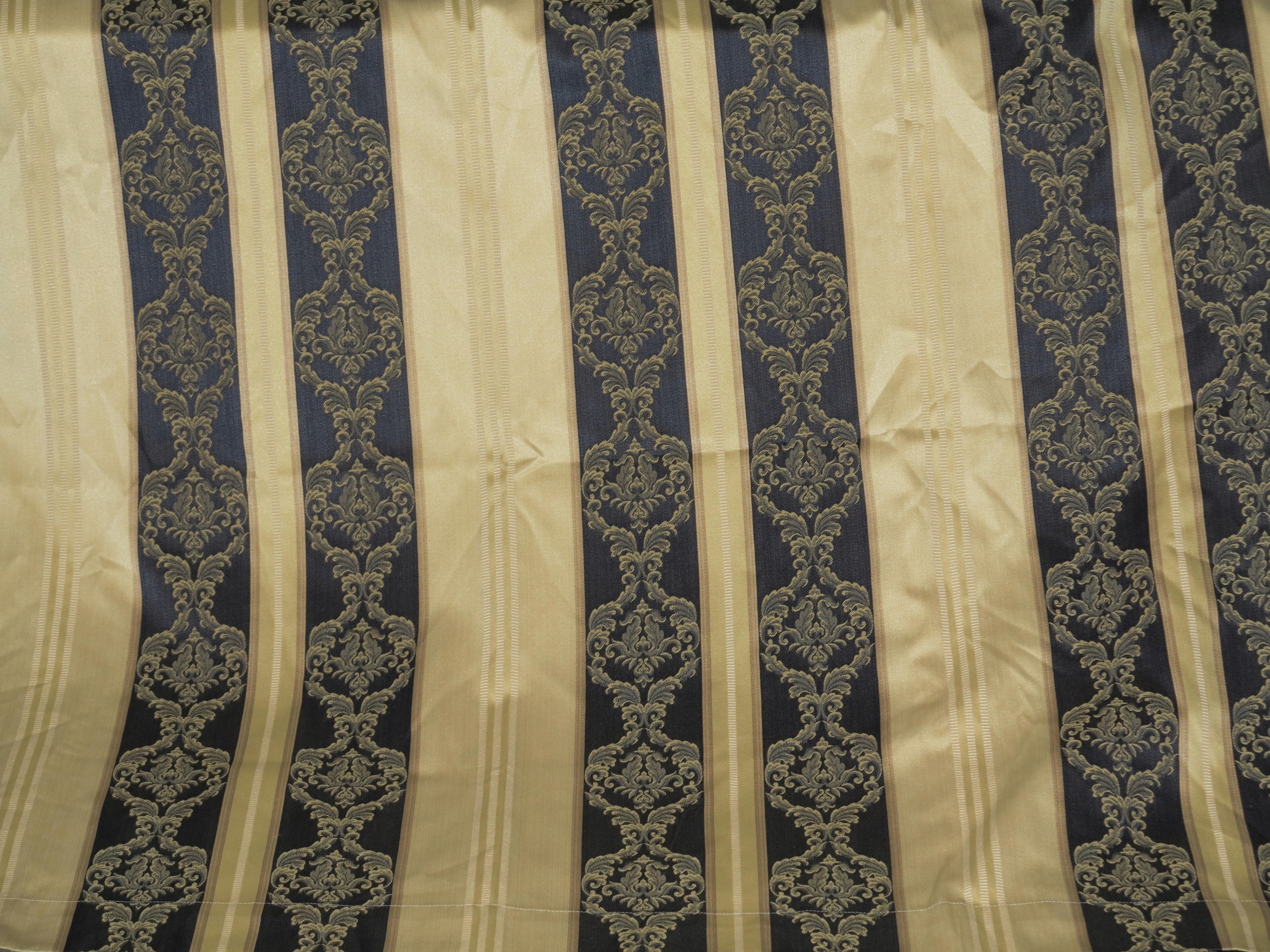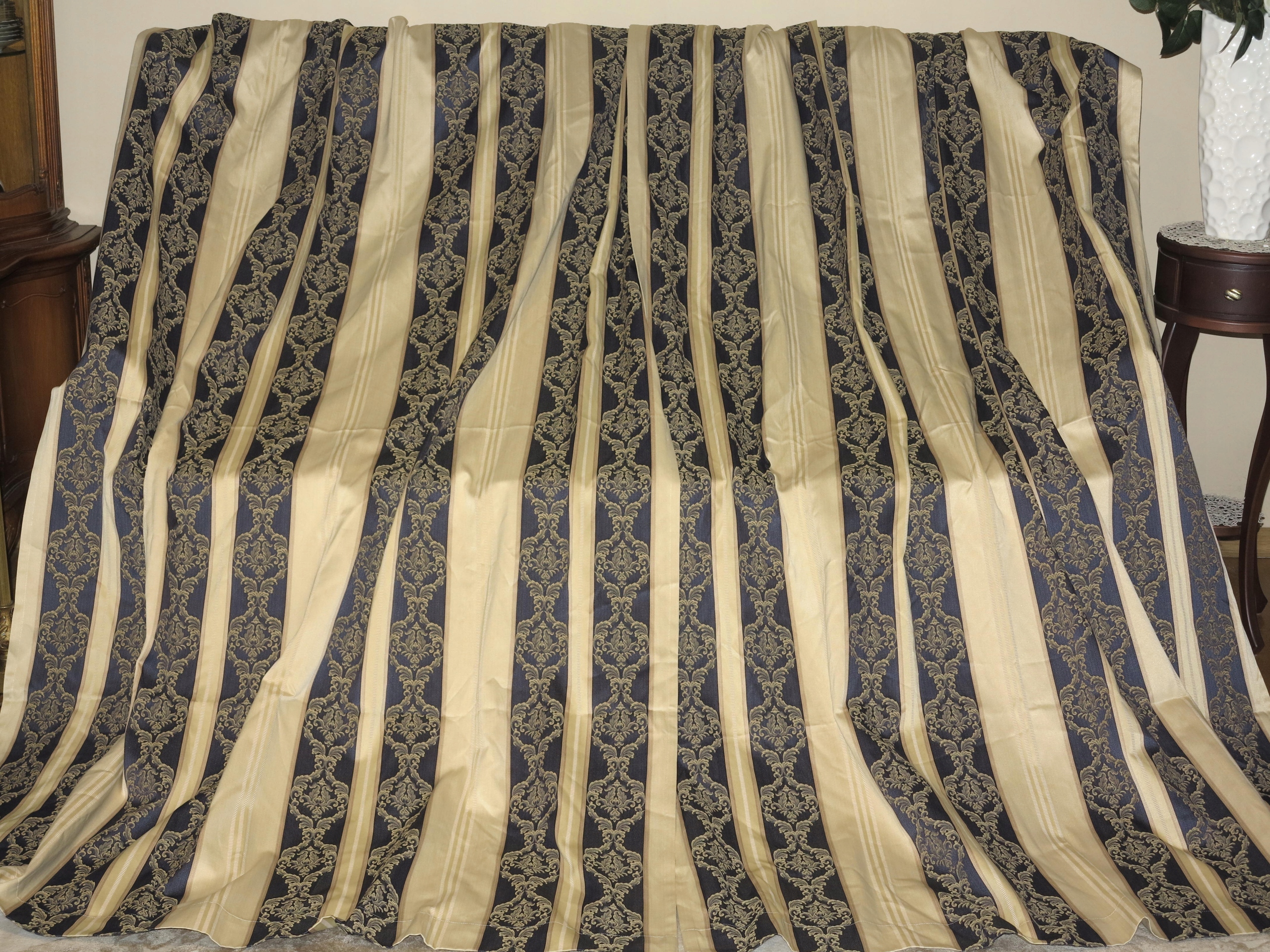 Przedmiotem aukcji jest komplet pięknych, wytwornych zasłon, w stylowe ludwikowskie pasy, z wybijanym wzorem. Wymiary pojedynczej zasłony, druga taka sama: długość 206,5cm, szerokość 136cm. Komplet używany, w super dobrym stanie.