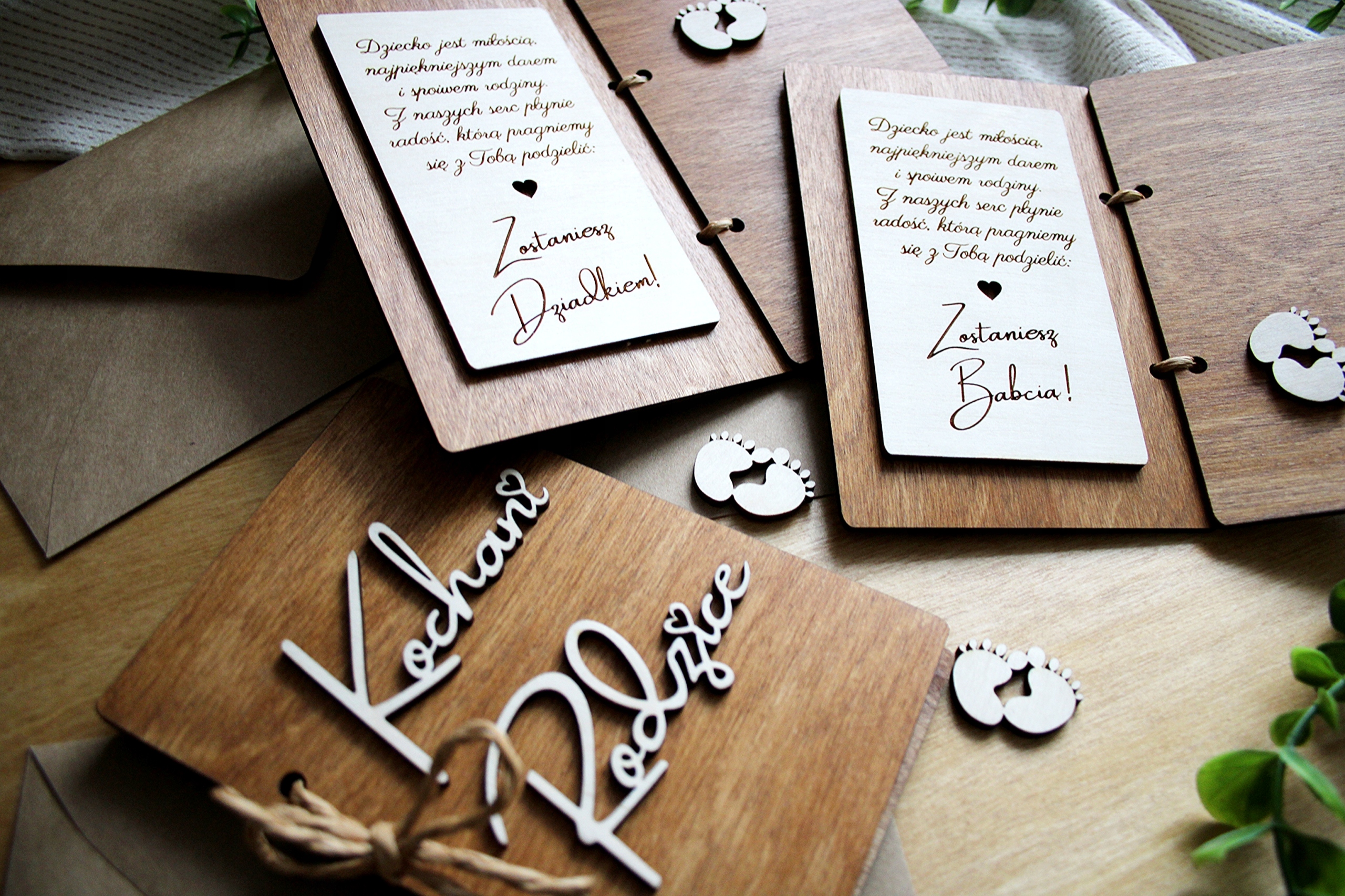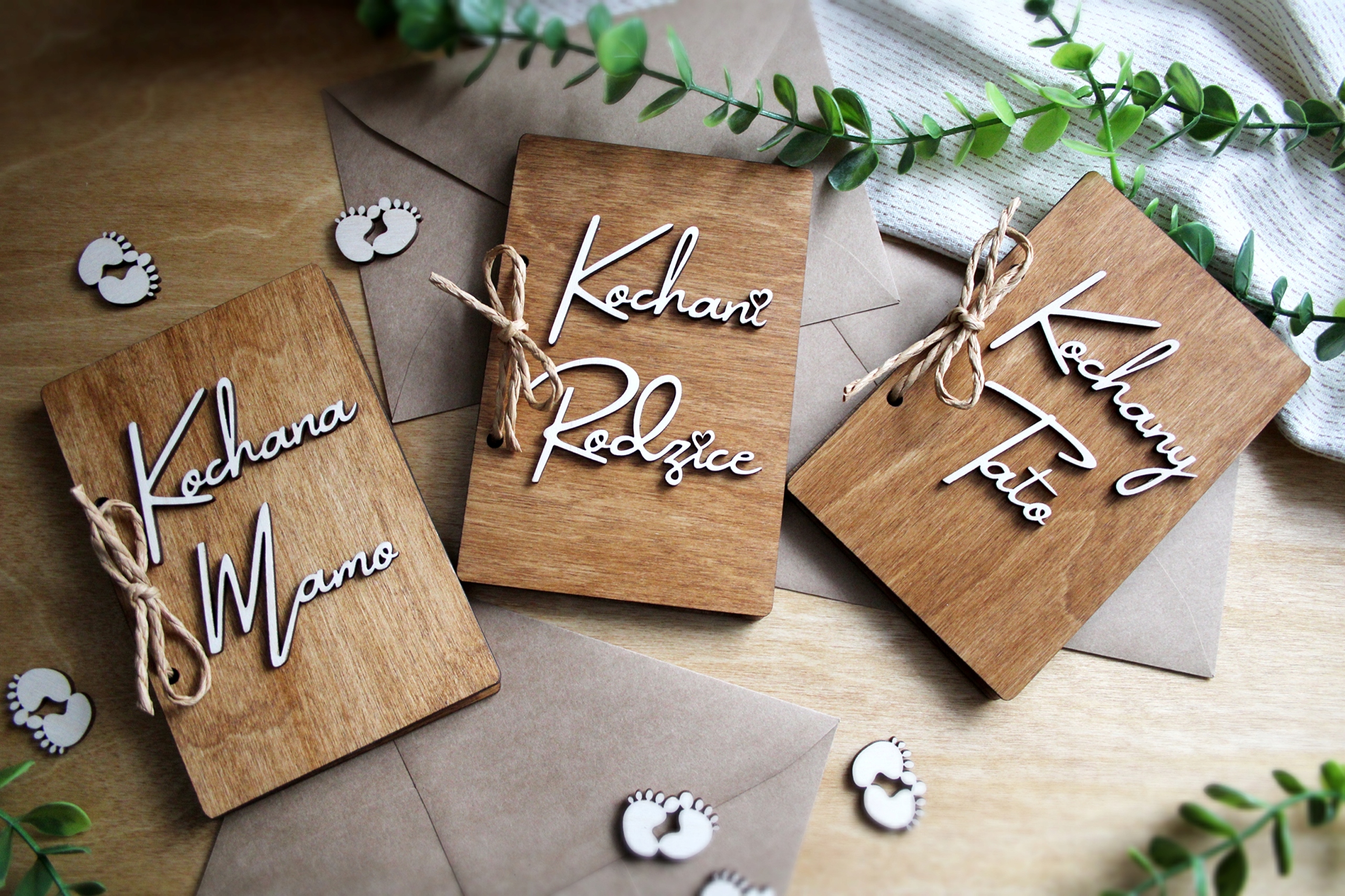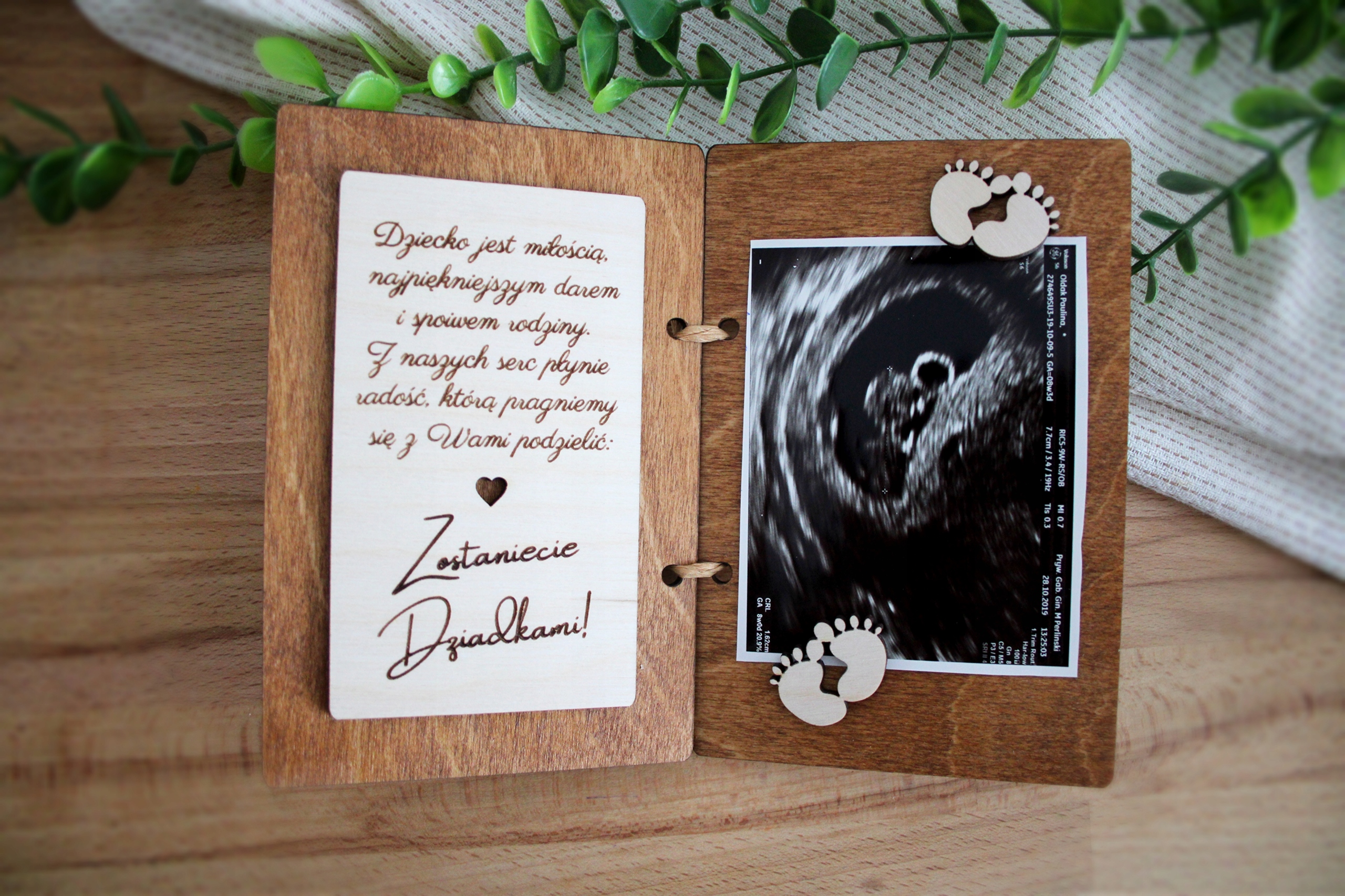 Piękna drewniana pamiątka dla rodziców z informacją o ciąży. Na zewnątrz napis Kochani Rodzice lub inny zwrot w zależności do kogo kierowana jest informacja, a w środku wzruszający tekst informujący o ciąży. Do pamiątki dołączone są małe stopki zawierające taśmę dwustronną umożliwiające przyklejenie zdjęcia usg.