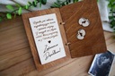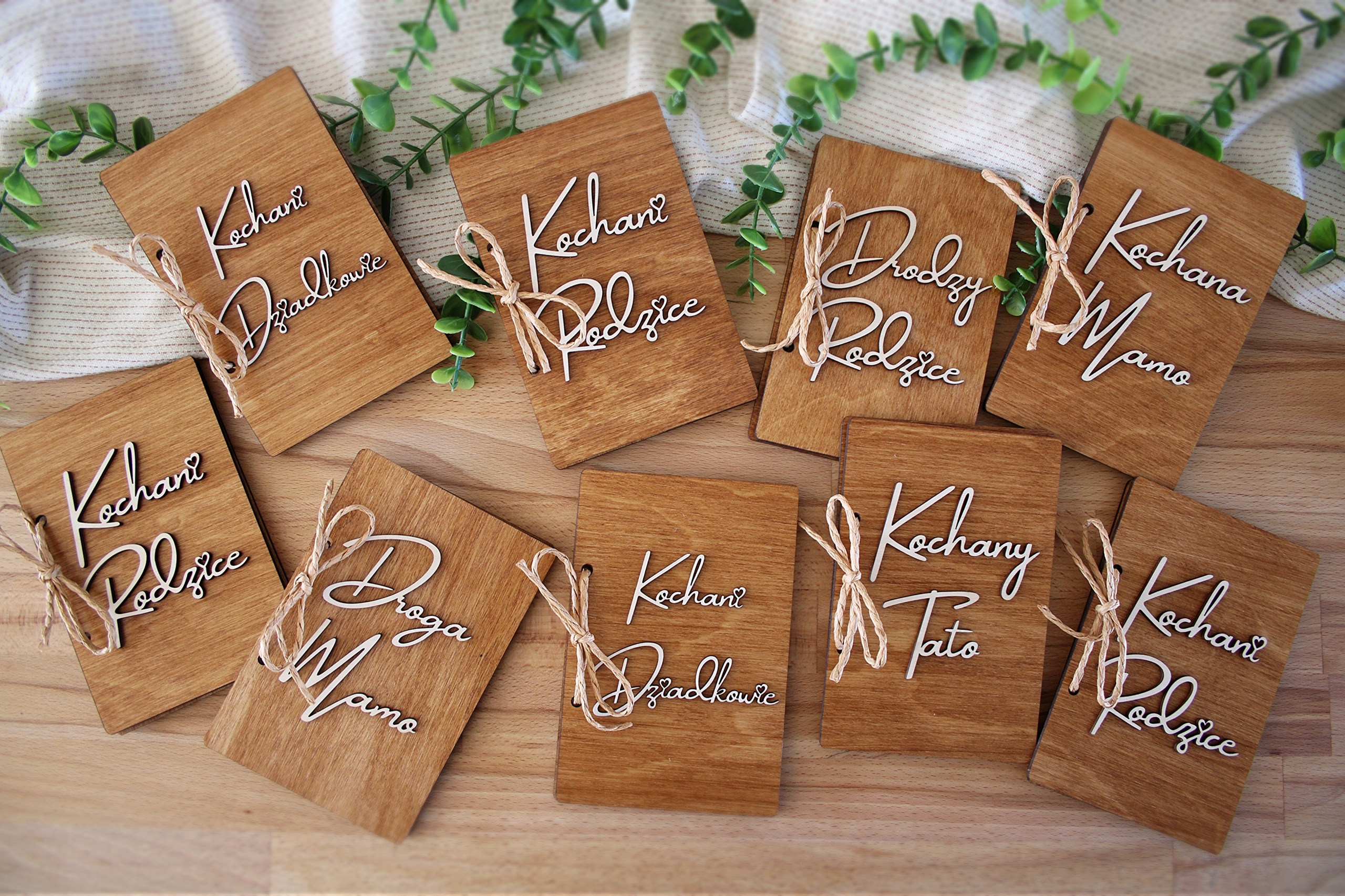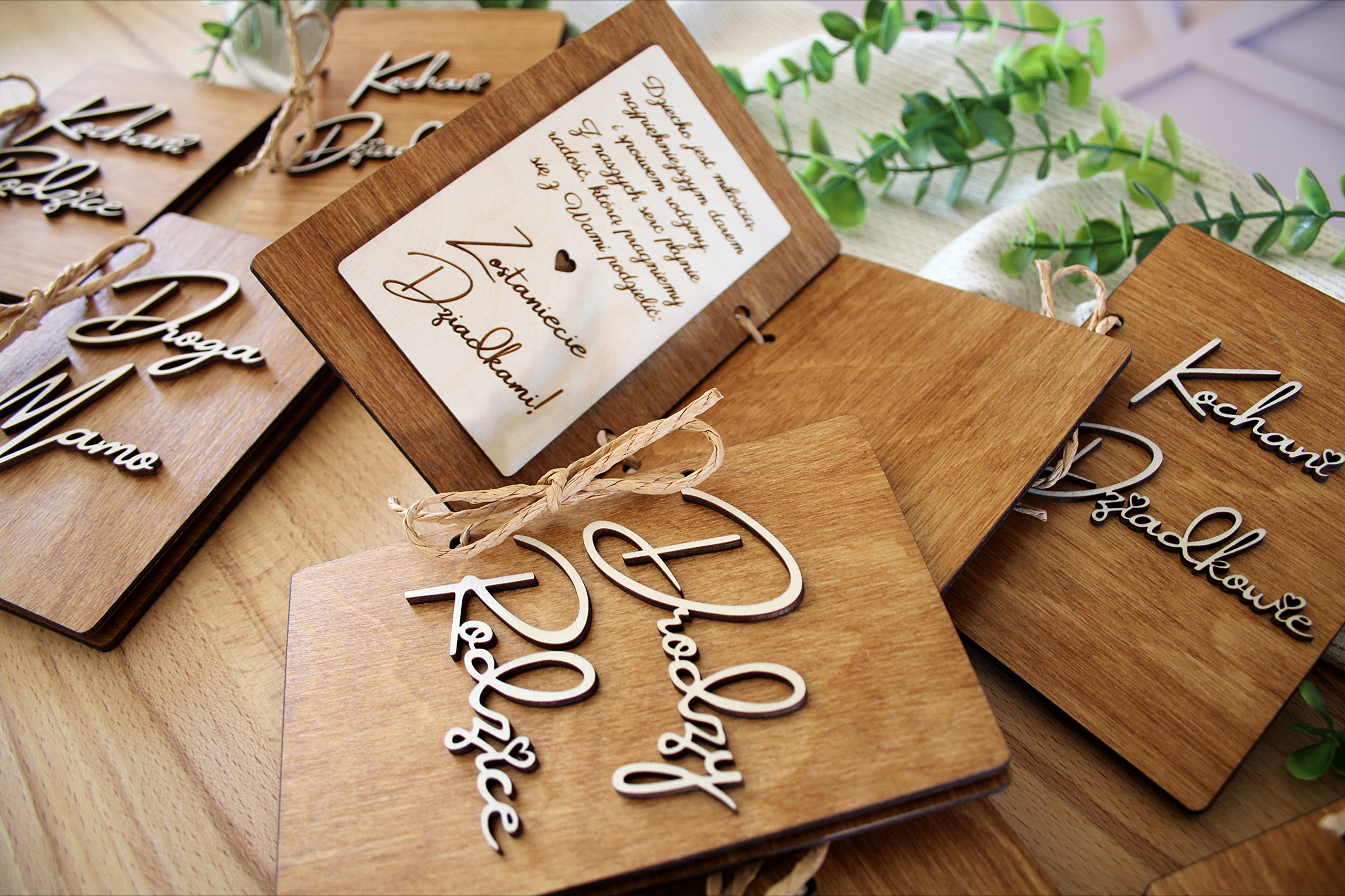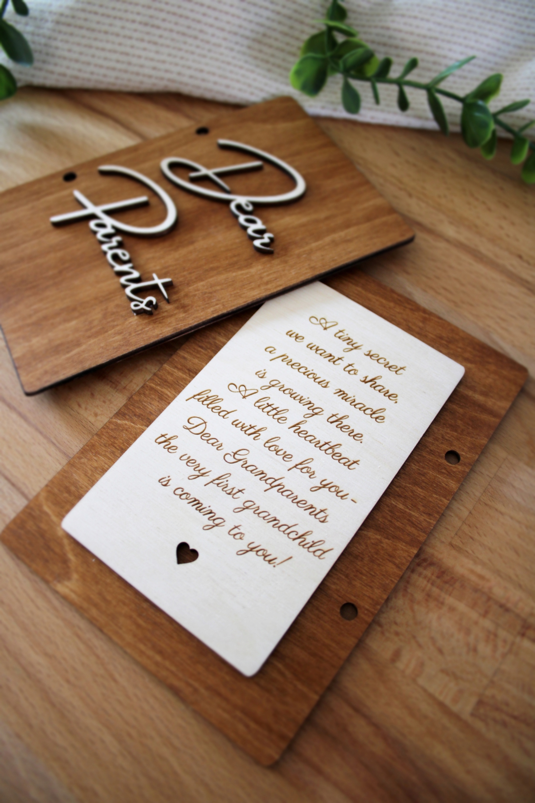 Piękna drewniana pamiątka dla rodziców z informacją o ciąży. Na zewnątrz napis Kochani Rodzice lub inny zwrot w zależności do kogo kierowana jest informacja, a w środku wzruszający tekst informujący o ciąży. Do pamiątki dołączone są małe stopki zawierające taśmę dwustronną umożliwiające przyklejenie zdjęcia usg.