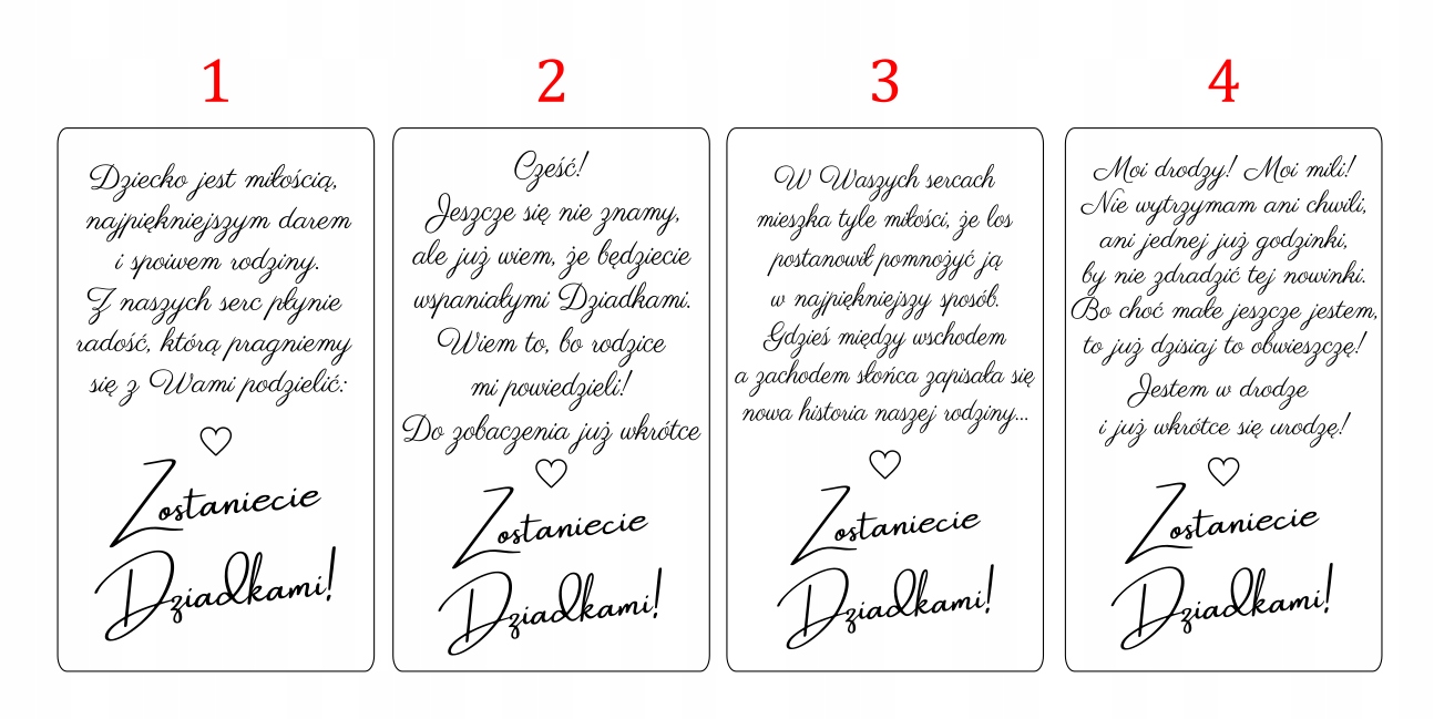 Uwaga! Teksty będą automatycznie dostosowane do liczby pojedynczej, jeżeli pamiątka będzie kierowana np. do mamy to w zależności od wybranego tekstu będą to formy: