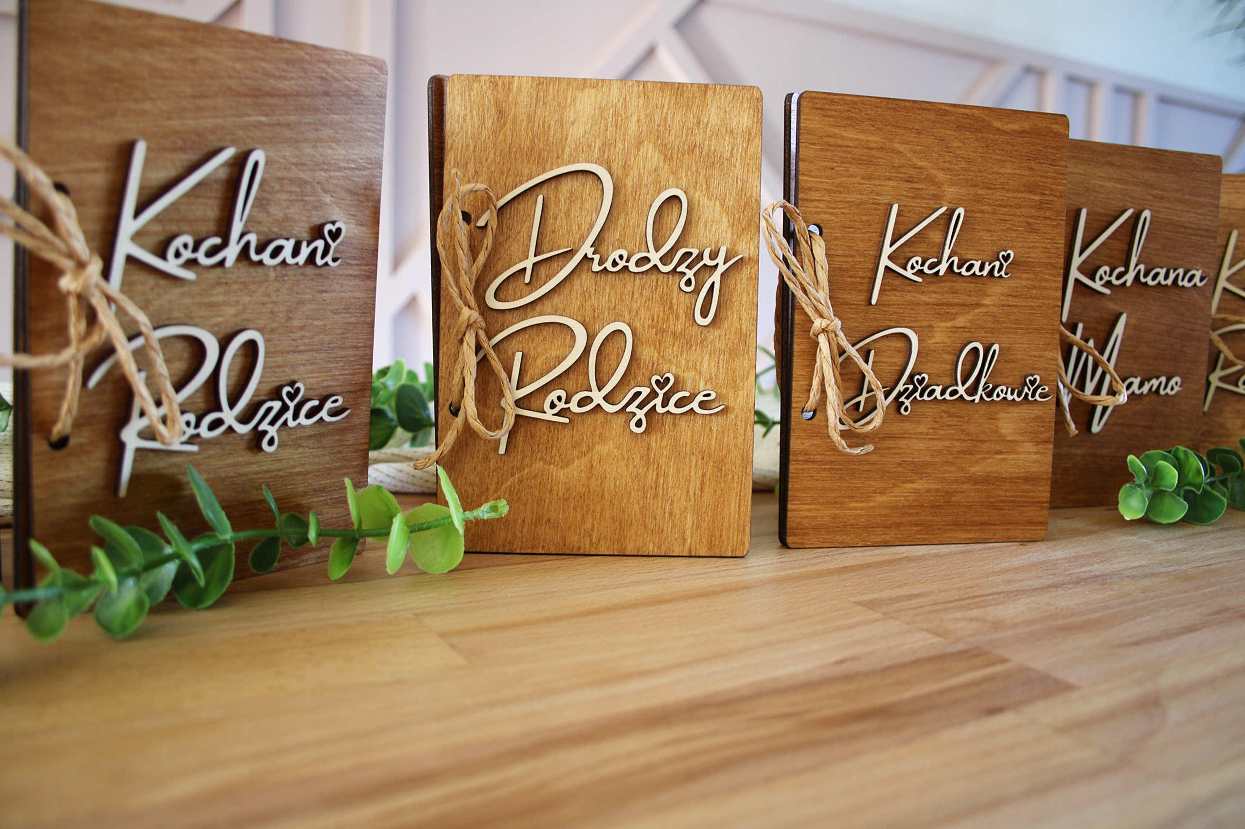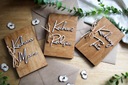 * Produkt wykonany ręcznie z dbałością o każdy szczegół - okładka została pokryta bejcą w ciepłym orzechowym kolorze a następnie lakierem matowym, który wygładza powierzchnie i podkreśla słoje nadając piękny efekt końcowy.