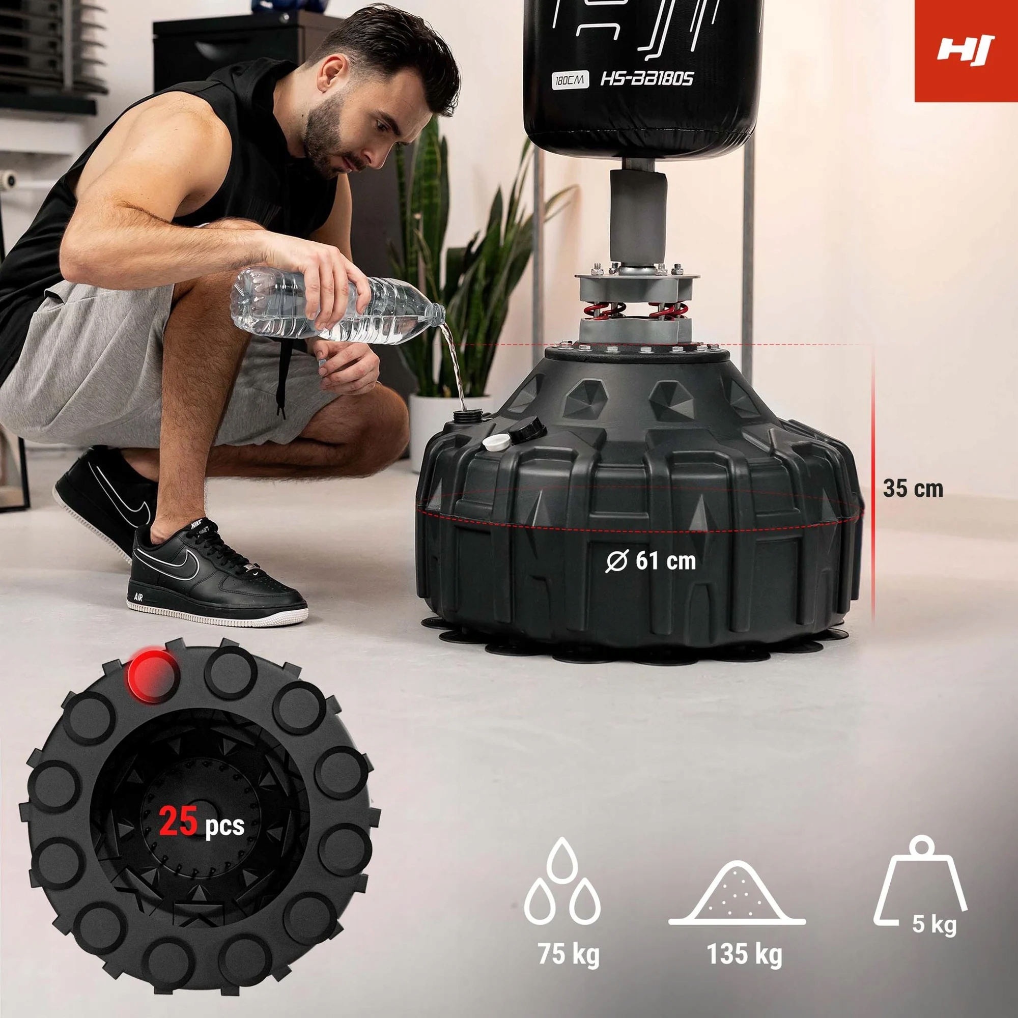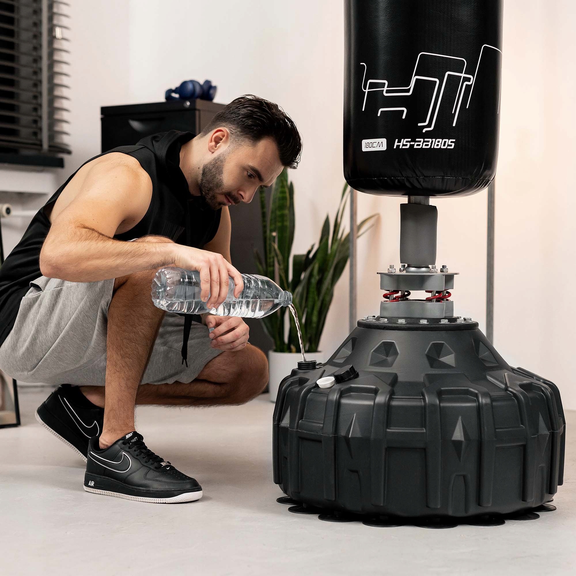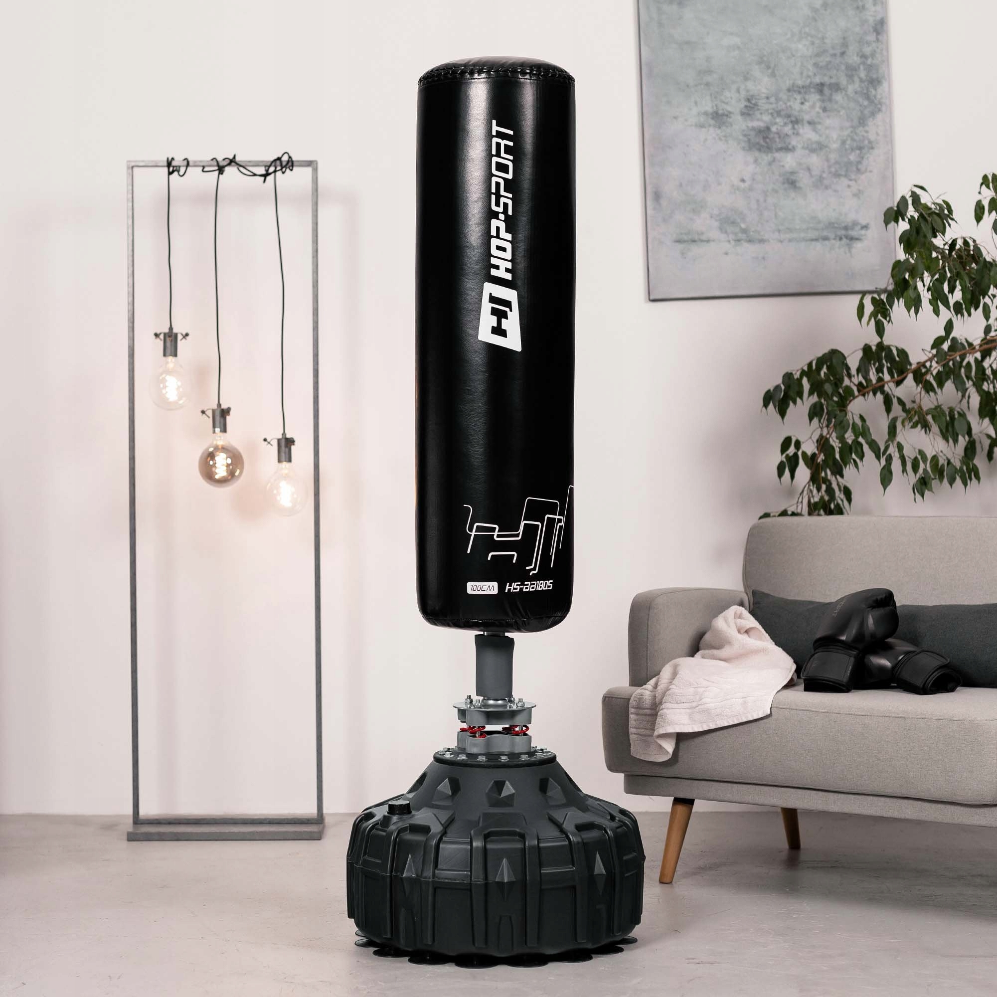 Свободно стоящая сумка Hop-размер Спорт 180 x 32 см - отличное предложение как для тренировок по боевым искусствам, так и в качестве инструмента для укрепляющих упражнений, направленных на развитие силы и скульптуры мышц. Благодаря примененным инновациям, таким как система anti-shock, подпружиненная основа и технология вращение на 360 градусов, он обеспечивает эффективную и безопасную тренировку, полностью устраняя необходимость монтаж в потолке, что необходимо для традиционных боксерских сумок.