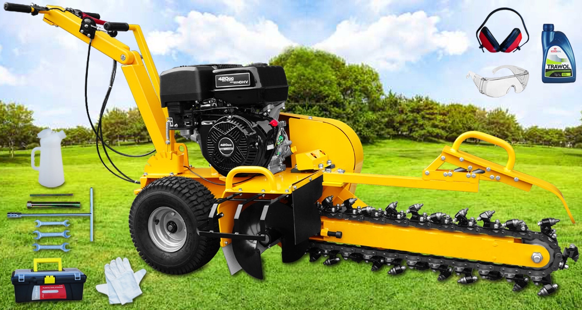 Koparka łańcuchowa WOODGRAIN GF-1500 to profesjonalna maszyna przeznaczona do wykonywania wykopów pod kable, rury, nawodnienie, wykopywania rowów na instalacje wodociągowe ,czy systemy nawadniające. Dzięki swojej precyzji , szybkości, gabarytom z łatwością wykona wykopy w pobliżu ogrodzeń lub innych obiektów , w miejscach trudno dostępnych nawet z bardzo twardą ziemią!