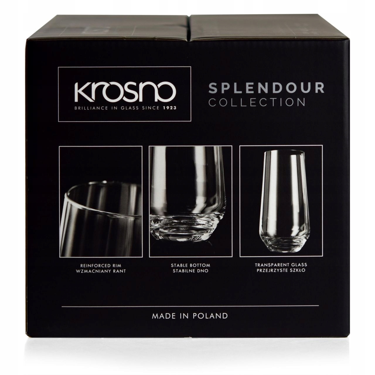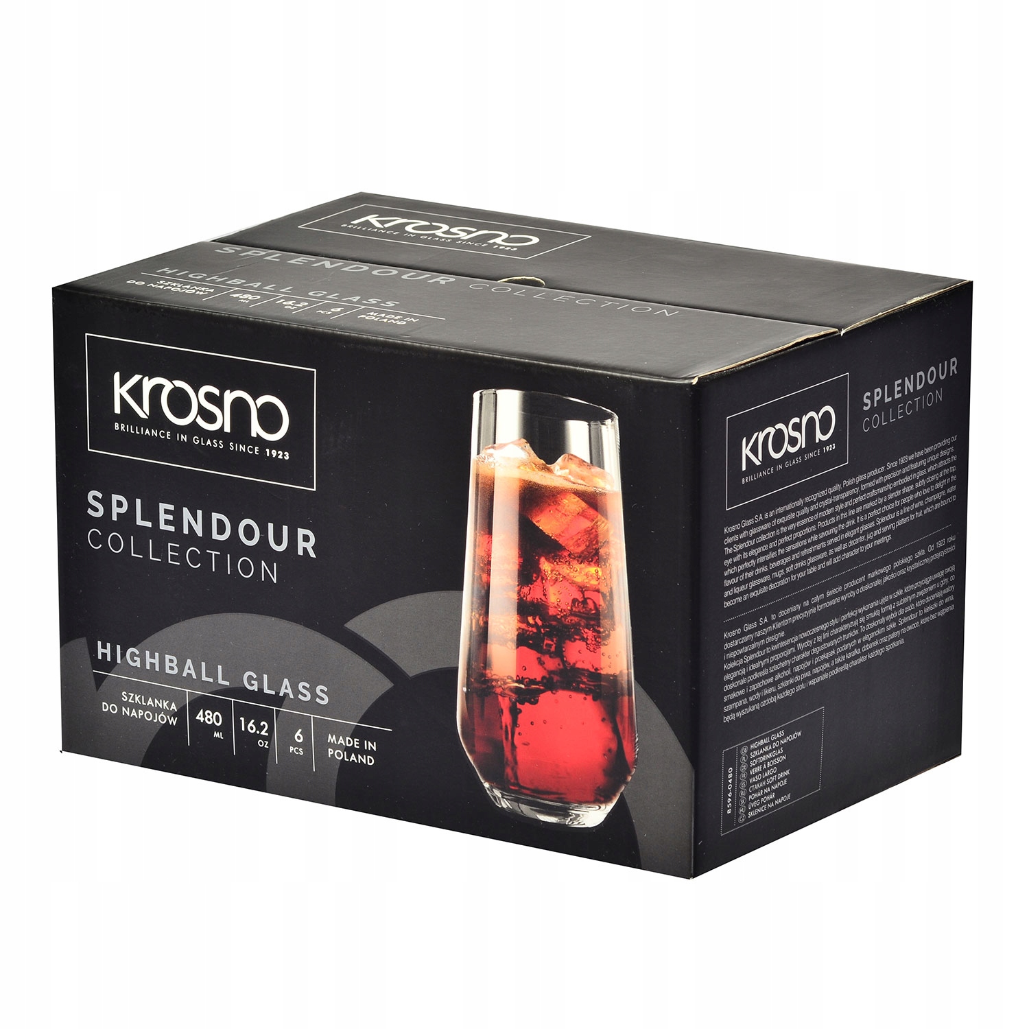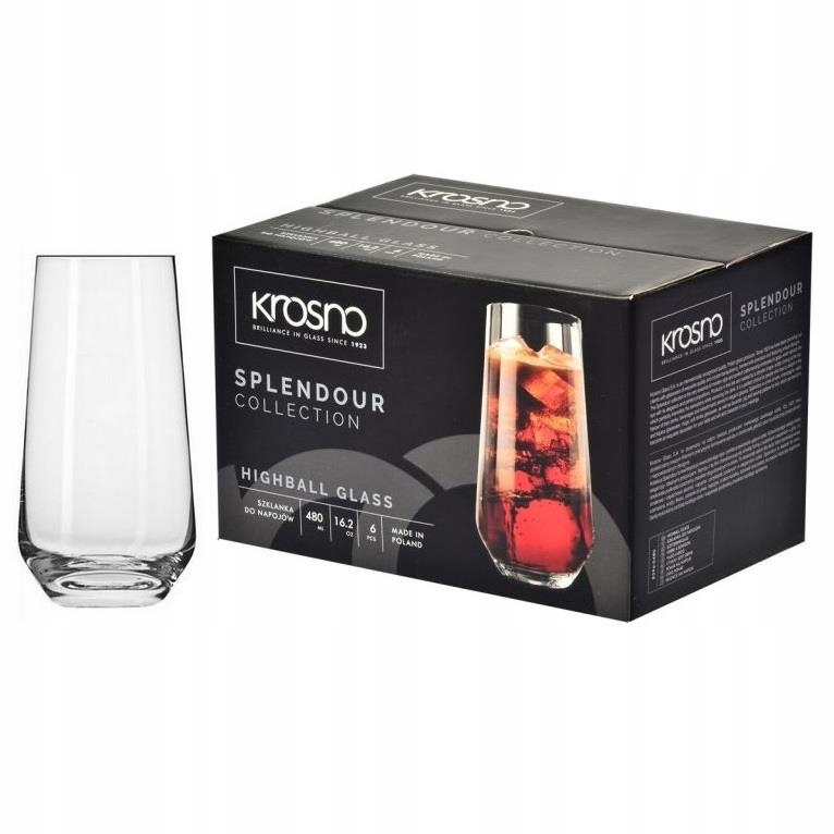 Zestaw 6 wysokich szklanek o pojemności 480 ml z serii Splendour firmy Krosno. Eleganckie i poręczne szklanki Splendour doskonale sprawdzą się do podawania, wody, soków, drinków lub innych napojów. Smukły kształt szklanek – szersze, stabilne dno i ścianki zwężające się ku górze ze wzmocnionym rantem – wpływa na komfort użytkowania. Klasyczny design wkomponuje się w każdy wystrój.