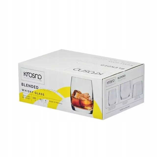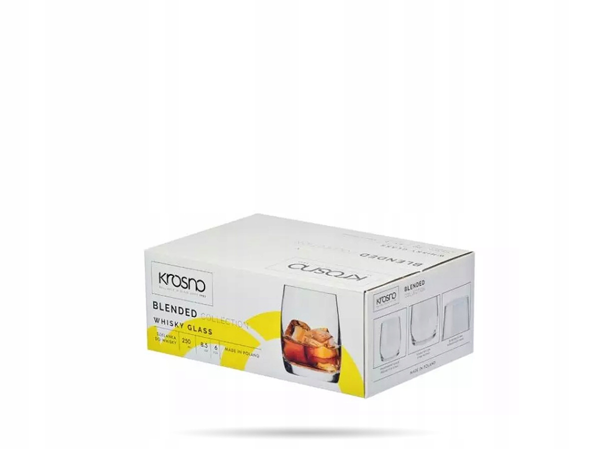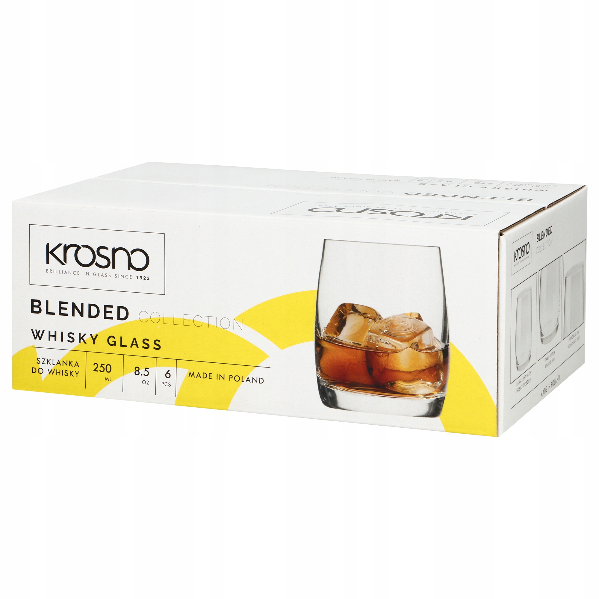 Zestaw 6 niskich szklanek o pojemności 250 ml z serii Blended firmy Krosno. Elaganckie szklanki doskonale sprawdzą się do podawania w nich whisky. Pękaty, beczułkowaty kształt, solidne dno i wzmacniany rant sprawia, że szklanki są nie tylko trwałe i solidne, ale także bardzo wygodne w użyciu. Wykonane z wysokiej jakości szkła o dużej przejrzystości efektownie eksponuje serwowane w nich trunki.
