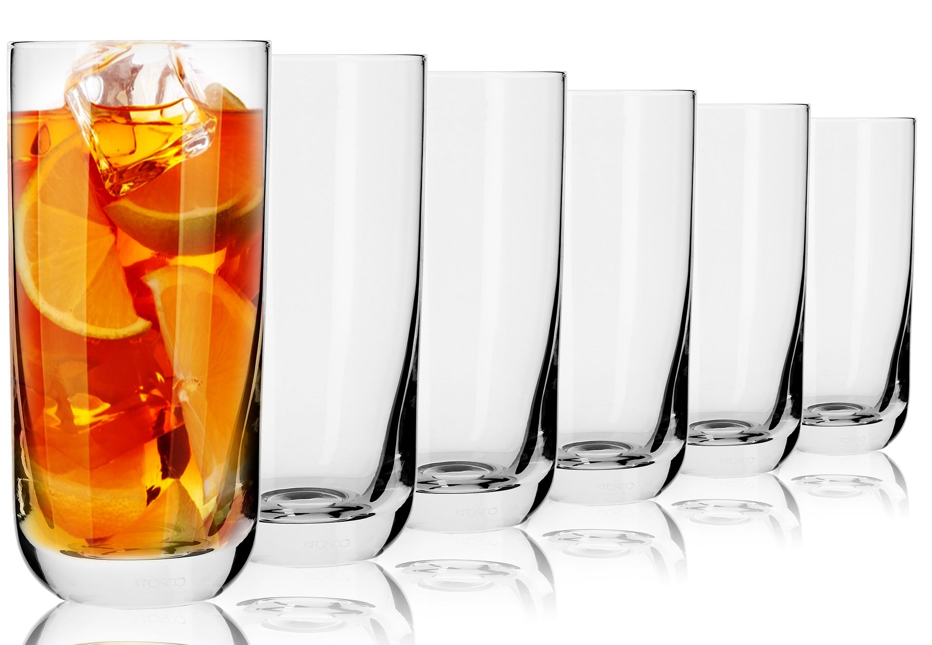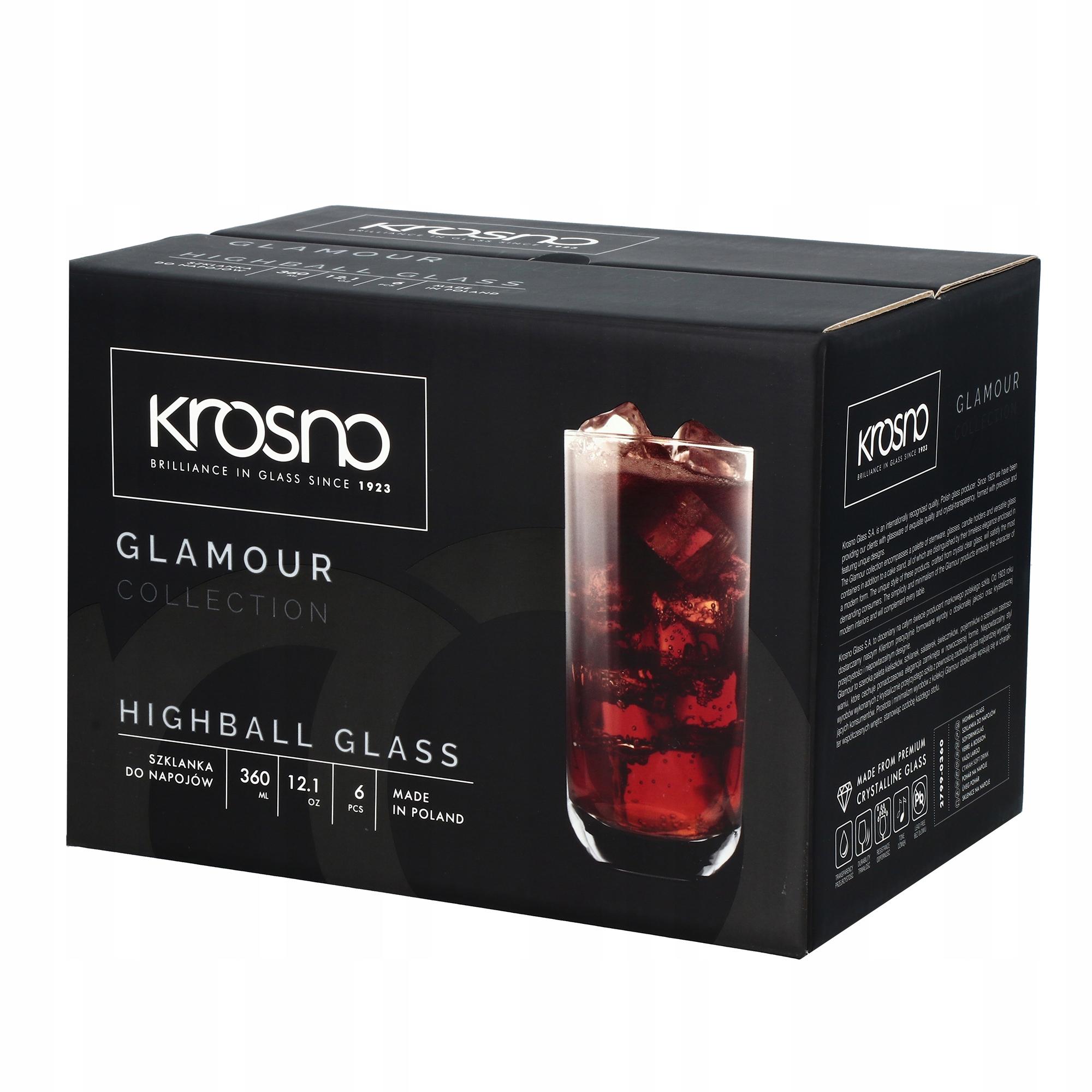 Zestaw 6 wysokich szklanek o pojemności 360 ml z serii Glamour firmy Krosno. Doskonale sprawdzą się do podawania w nich drinków, soków lub wody. Cylindryczny kształt szklanki osadzony na solidnym, grubszym dnie sprawia, że są stabilne i wygodne w uzyciu.