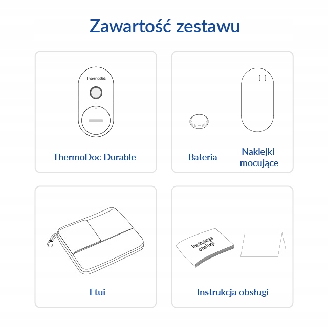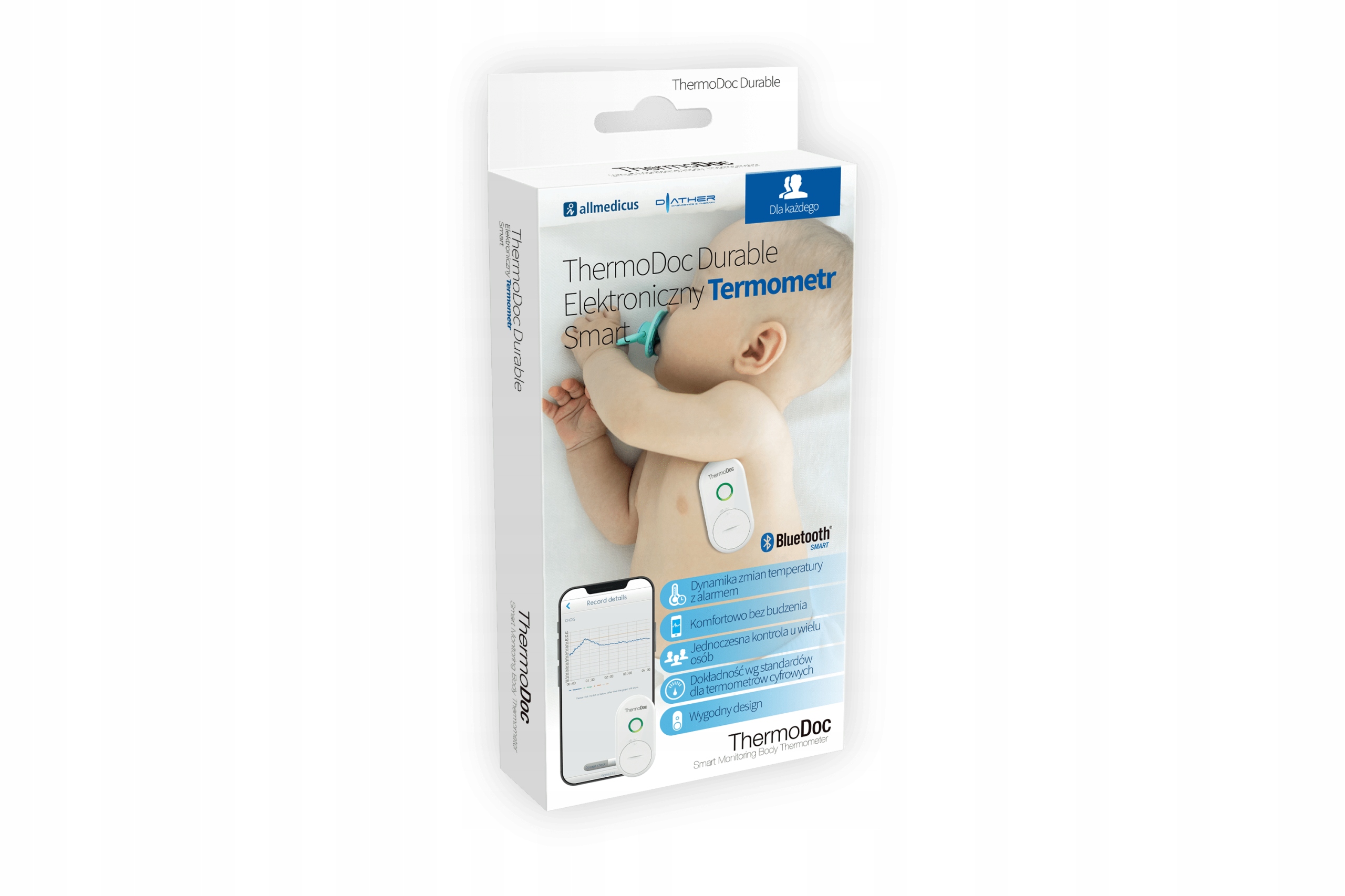Termometr ThermoDoc Durable współpracuje ze smartfonem, umożliwiając wyświetlenie temperatury ciała badanej osoby. Jest to elektroniczny termometr, który może być używany przez osoby w każdym wieku. Jest to wyrób medyczny przeznaczony do samokontroli w warunkach domowych oraz do użytku profesjonalnego.