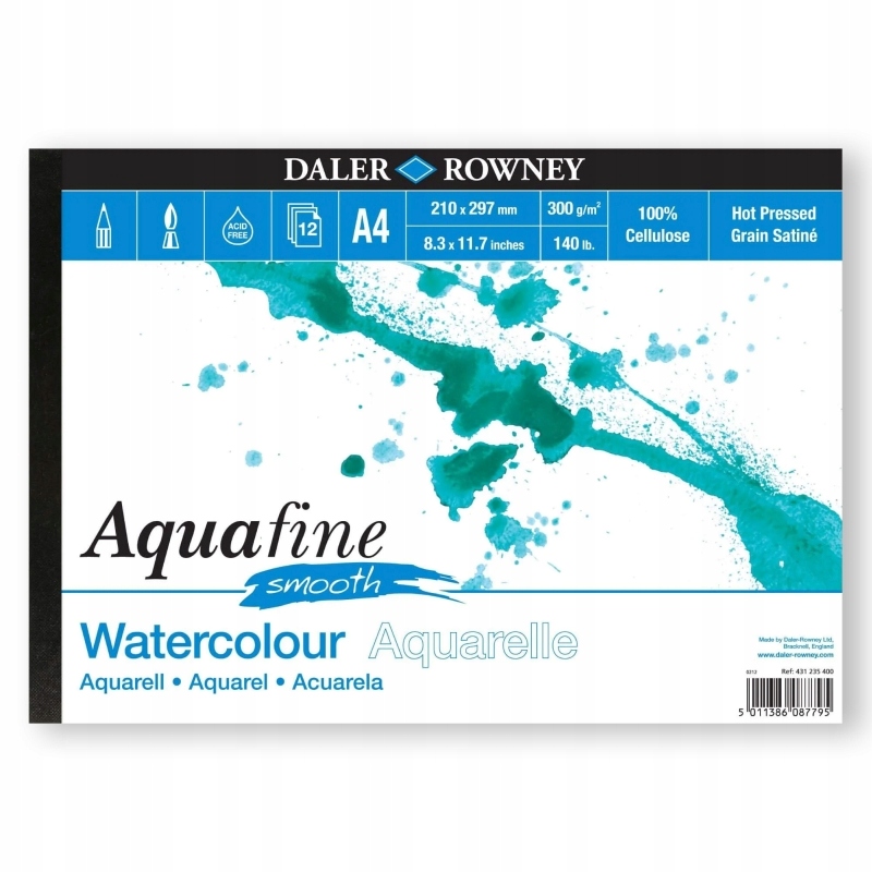 Aquafine Smooth to blok akwarelowy firmy Daler-Rowney o zdecydowanie gładkich i grubych arkuszach bezkwasowego papieru o gramaturze 300 g/m². Produkowany z dziewiczej pulpy drzewnej, buforowany węglanem wapnia jest niezwykle trwały, nie wygina się i marszczy, jest odporny na przebarwienia i wolny od wybielaczy. Chłonie wodę bez efektu deformacji arkusza, dzięki czemu nie trzeba go naciągać ani naklejać. Współpracuje z fluidem maskującym, polecany dla amatorów, jak i artystów. Blok zawiera 12 arkuszy papieru w formacie A4 (21x29,7cm).