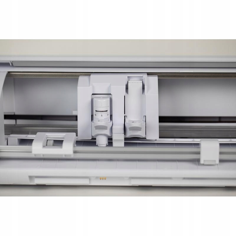 Dzięki podajnikowi, który otrzymasz w zestawie, w wygodny sposób możesz ciąć materiały podkładowe takie jak folia bezpośrednio z rolki. Podajnik nie znajduje się w bryle plotera, lecz jest dodatkowym akcesorium. Należy zamontować go przed rozpoczęciem pracy. Urządzenie jest również wyposażone we wbudowany odcinak.