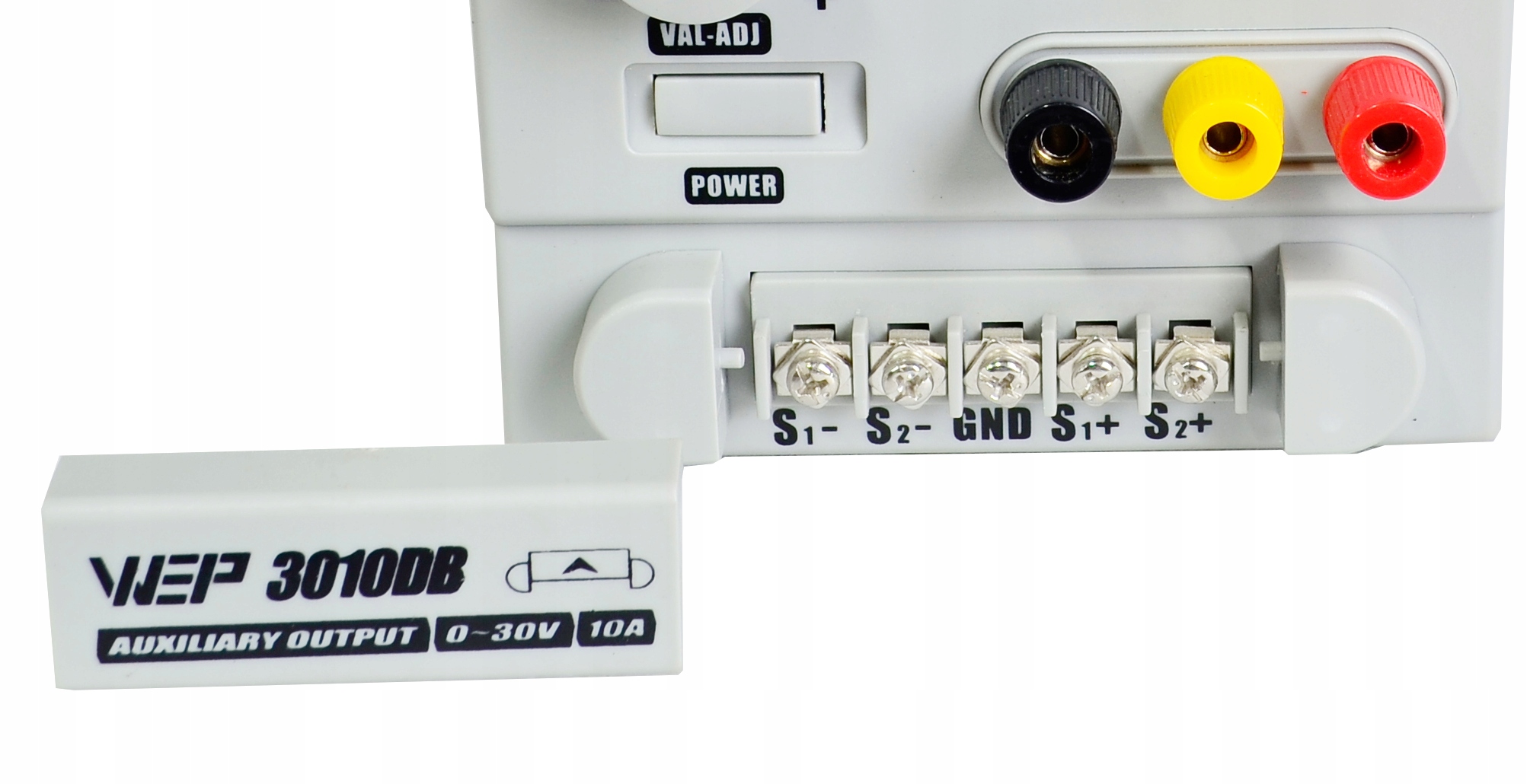 Zasilacz WEP 3010DB posiada jedno wyjście główne oraz dwa wyjścia pomocnicze, co umożliwia jednoczesne zasilanie do trzech urządzeń przy zadanym napięciu