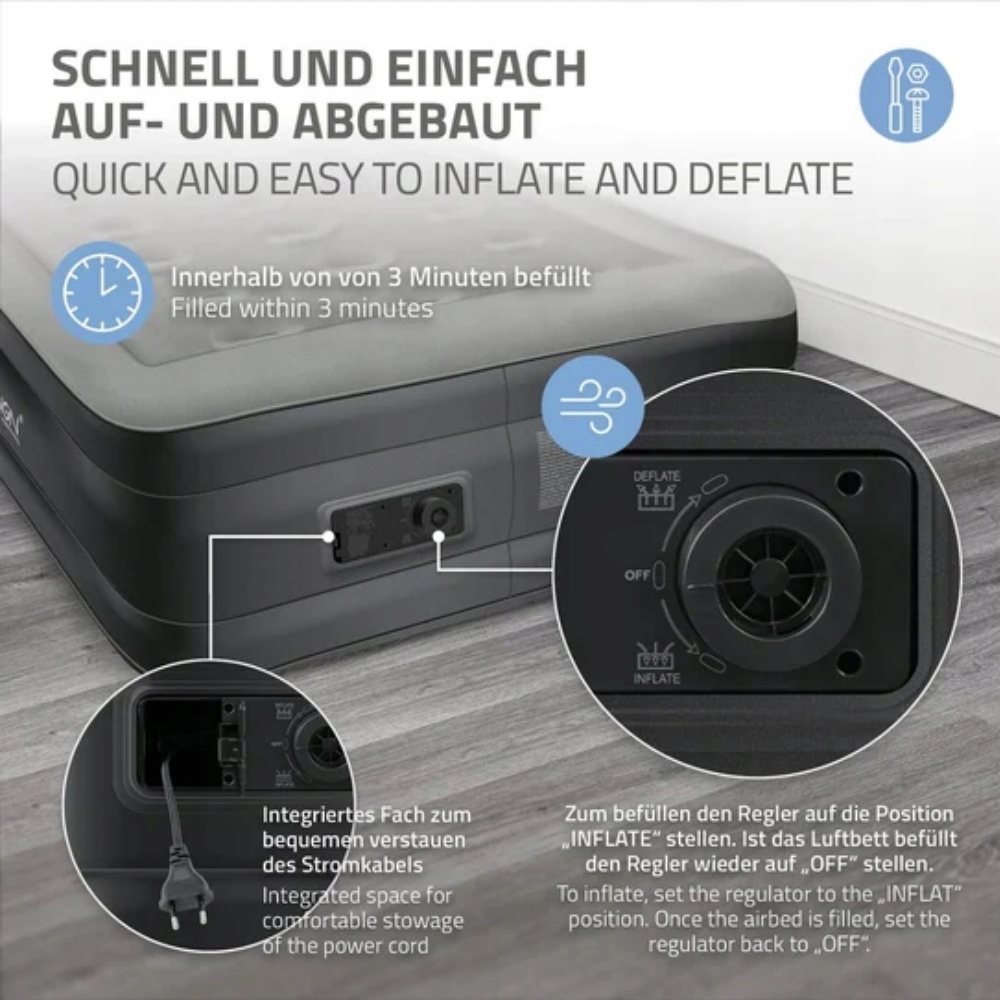 Łatwy montaż: Wbudowana pompka elektryczna nadmucha materac w ok. 4-5 minut. Ponadto łóżko dmuchane można łatwo przechowywać w dostarczonej praktycznej torbie podróżnej.