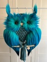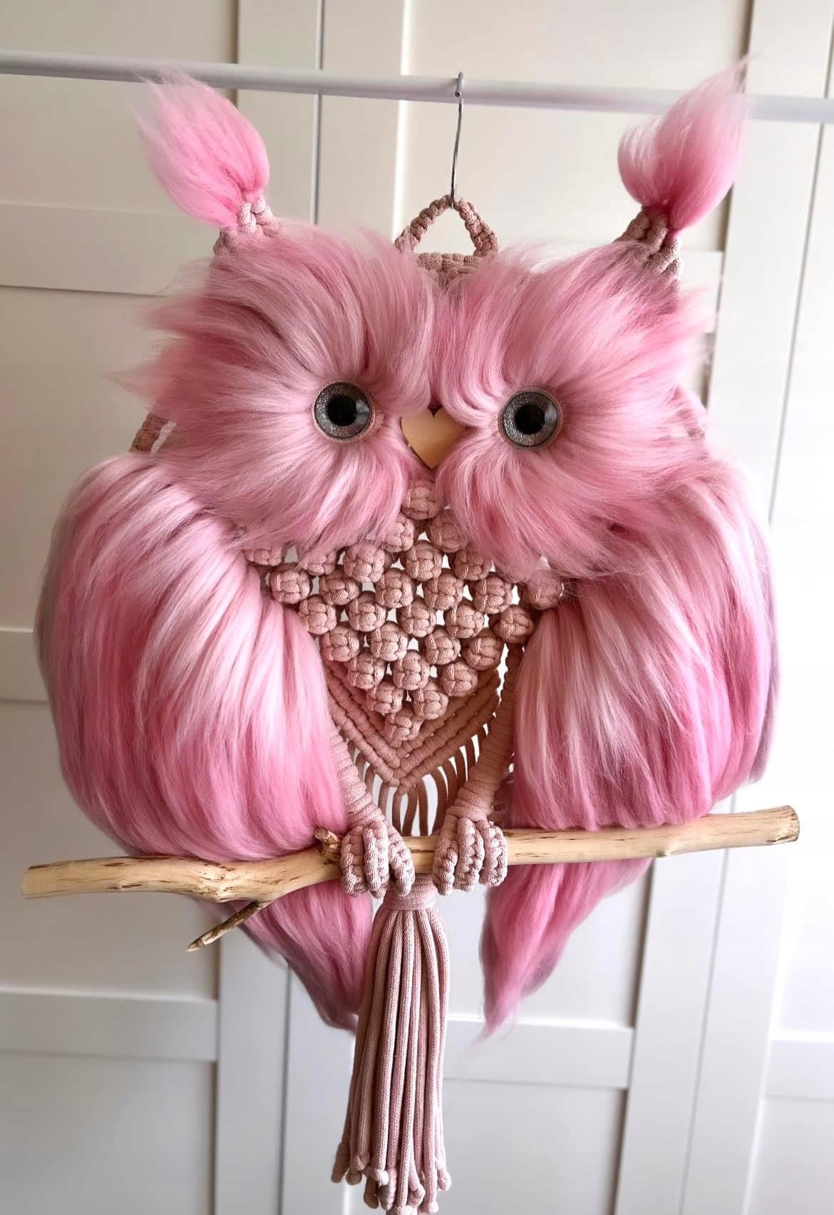 Sowa wykonana metodą makramy z dodatkiem wełny czesankowej.