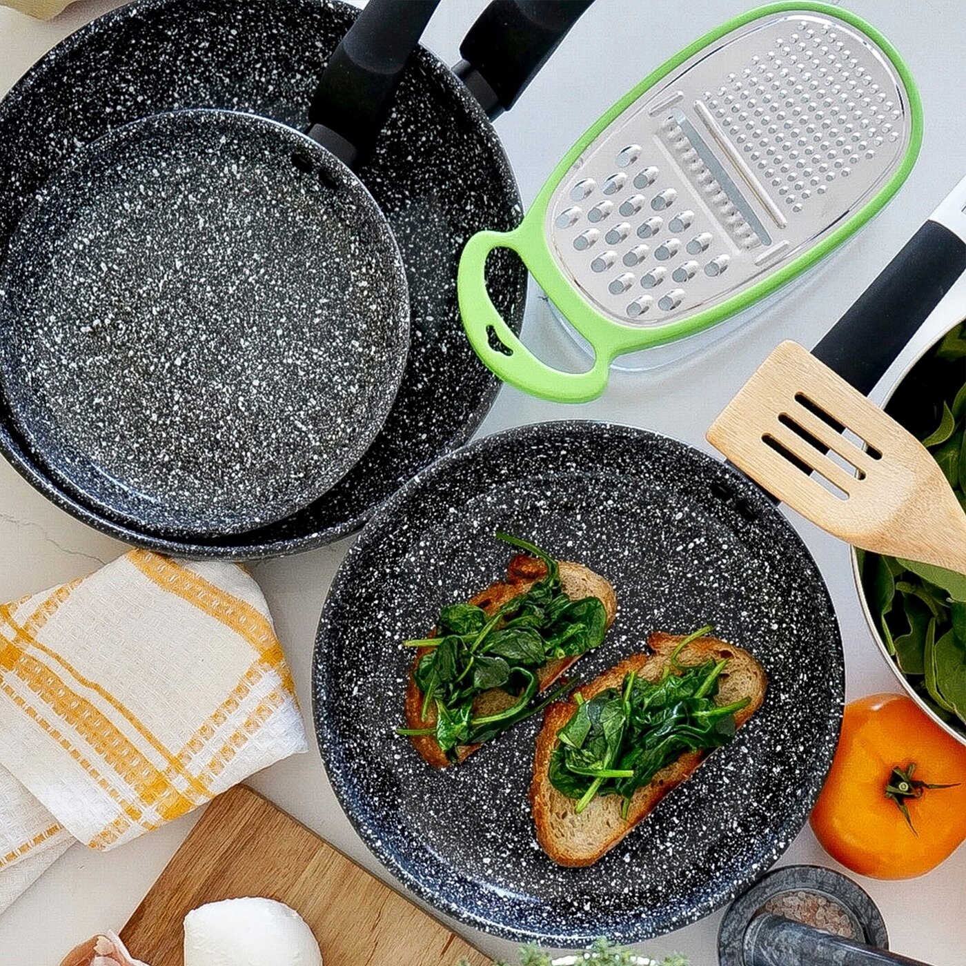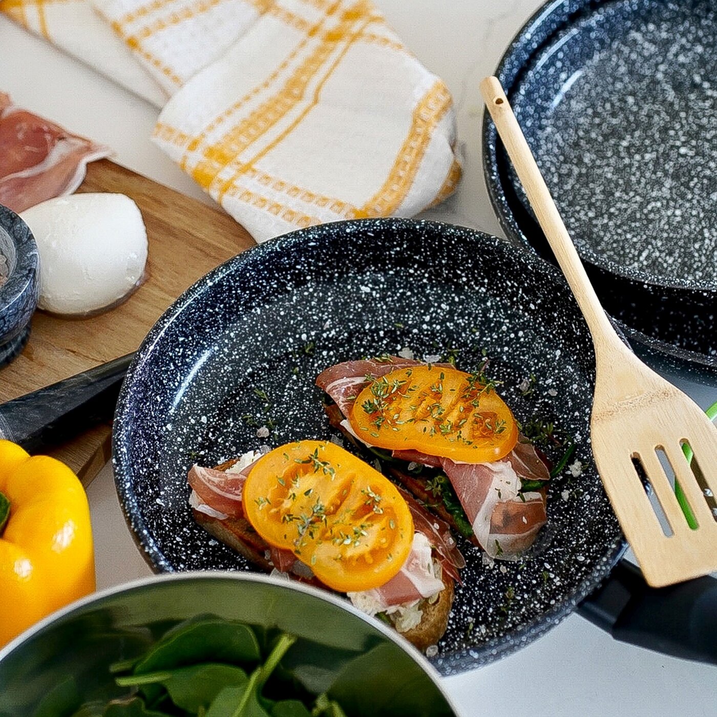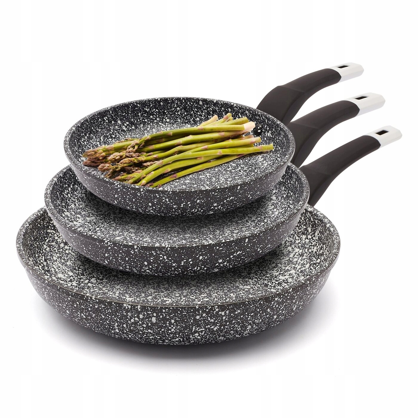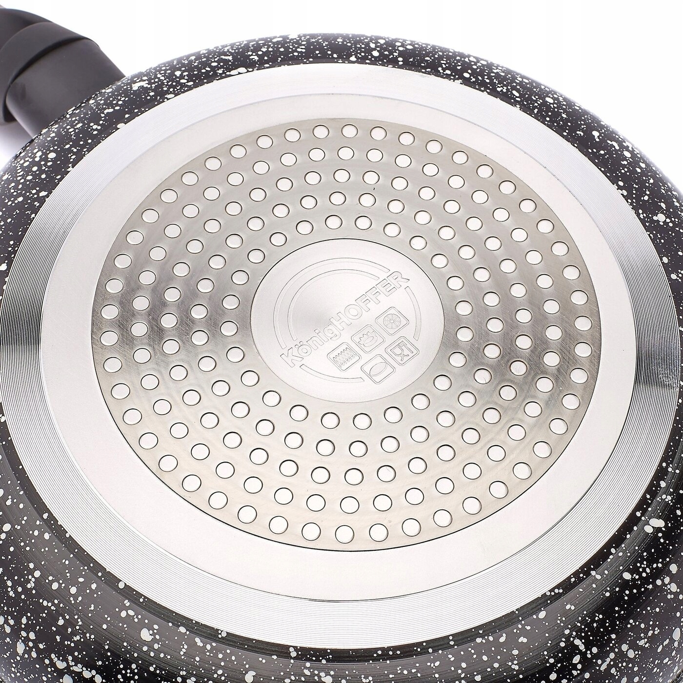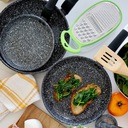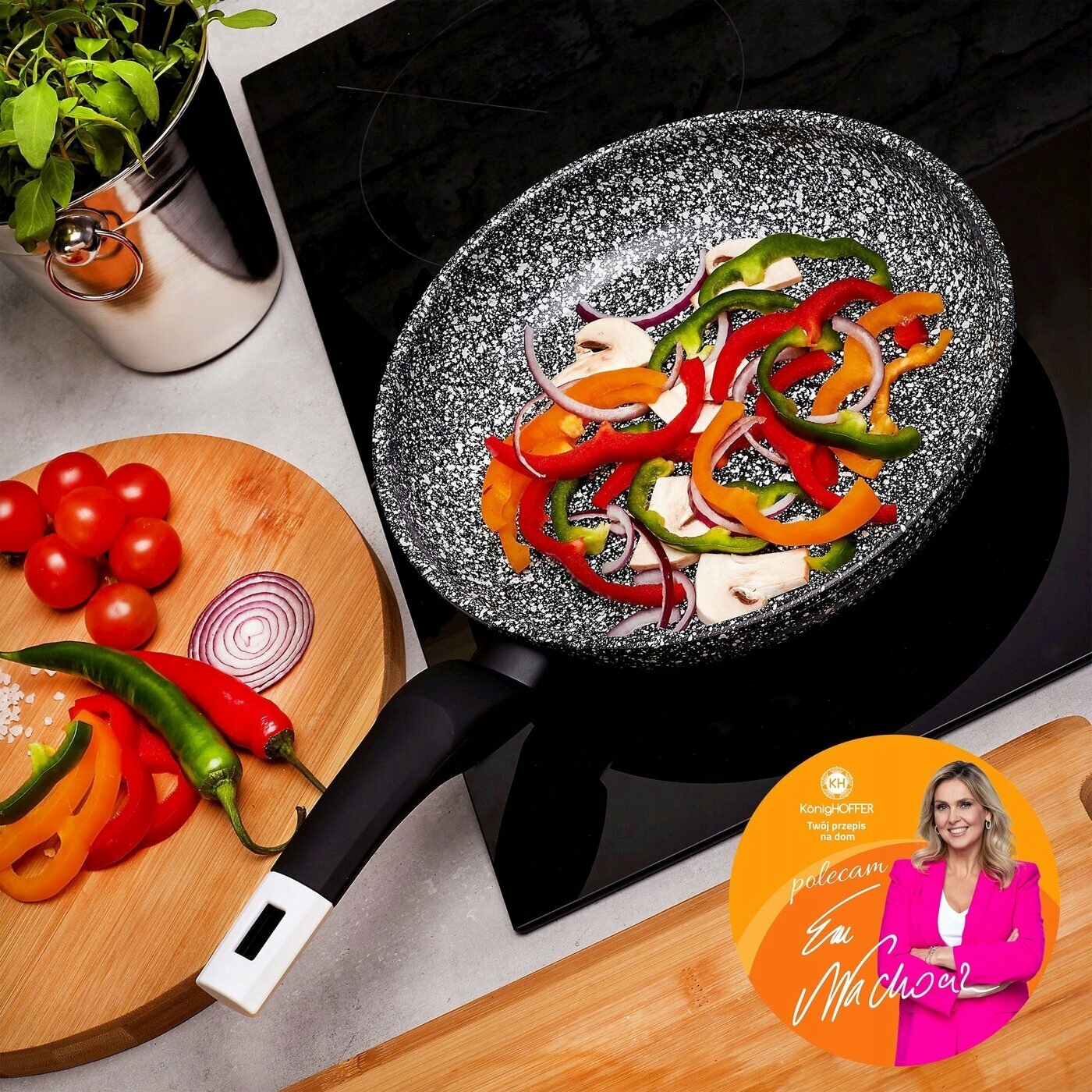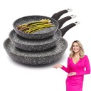 Komplet patelni ceramicznych typu stone Konighoffer 20/24/28 cm da ci możliwość użytkowania na wszystkich typach kuchenek. Można na nich smażyć z niewielkim dodatkiem tłuszczu. Zestaw zapewnia wysoki poziom komfortu podczas tworzenia posiłków poprzez ochronę składników przed przypaleniem oraz przywieraniem. To dobra opcja dla każdego, kto ceni sobie zdrową i pełnowartościową dietę. Patelnie charakteryzują się również bezproblemową pielęgnacją i długą żywotnością. Wytrzymałość powłoki ceramicznej, stylizowanej na biało-czarny marmur, zastosowanej w tym modelu wynosi aż 10 000 cykli ścierania (wynik 5 razy lepszy, niż mogą ci zaoferować klasyczne patelnie nieprzywierające). Ergonomiczne rączki wykończone tworzywem typu soft touch są antypoślizgowe, przyjemne w dotyku oraz nie nagrzewają się. Odlewany w technologii die cast korpus aluminiowy jest trwały i dobrze przewodzi ciepło oraz wygląda, jakby został zrobiony z granitu. Produkt ma rekomendację Ewy Wachowicz. Jako ambasadorka marki Konighoffer, gorąco i z uśmiechem poleca go ona do domowego użytku. Razem z nim zdobędziesz twój przepis na dom. To jedna z najlepszych opcji w tej kategorii!
