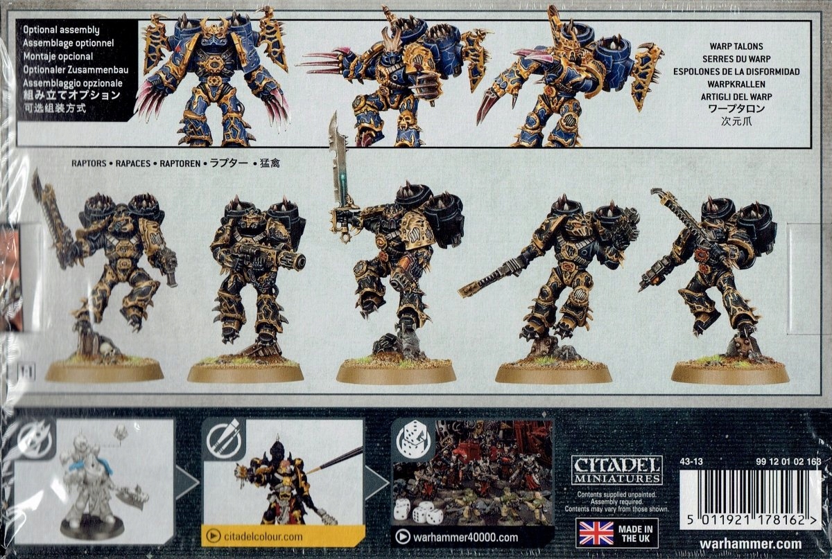 Ten wieloczęściowy plastikowy zestaw pudełkowy zawiera 116 komponentów, pięć okrągłych podstawek 32 mm i arkusz transferowy Chaos Space Marines, za pomocą którego można zbudować 5 Chaos Space Marines Raptors lub 5 Chaos Space Marines Warp Talons.