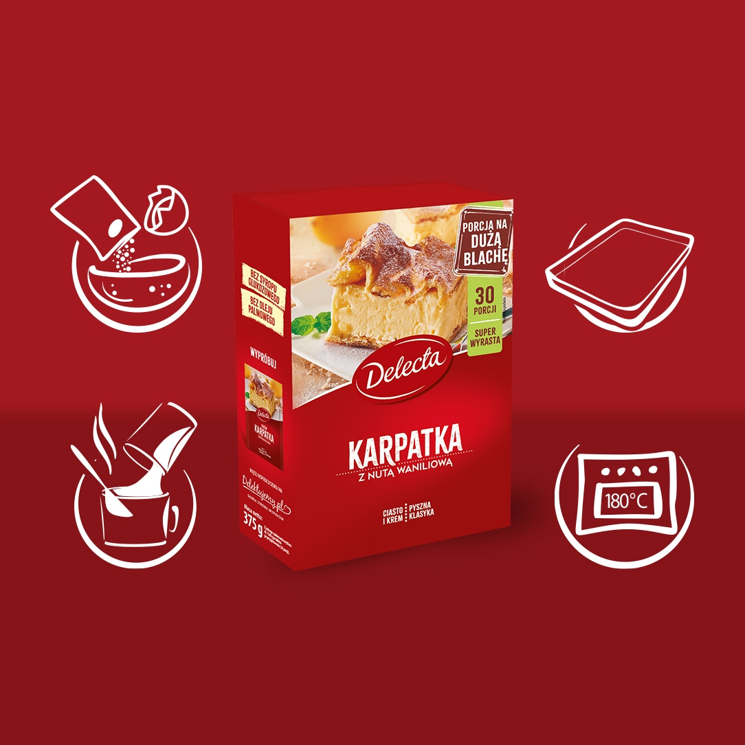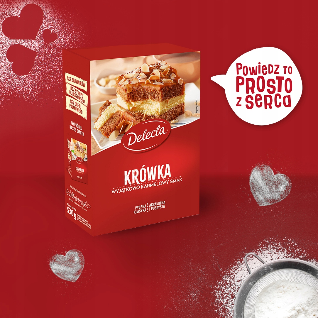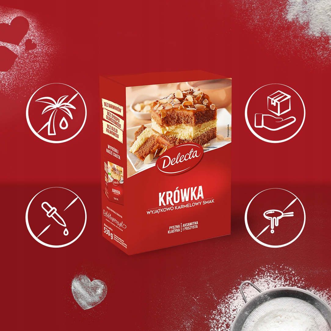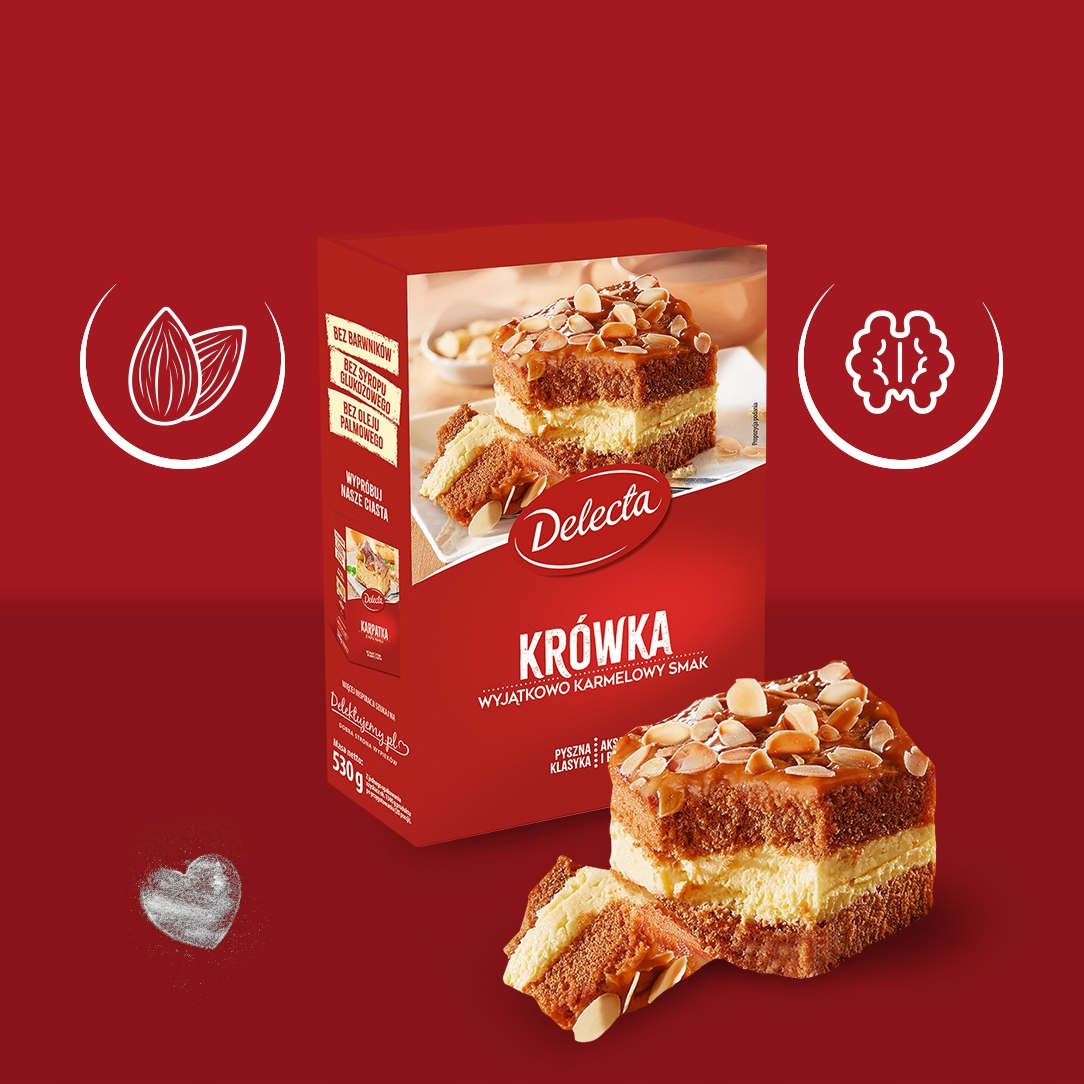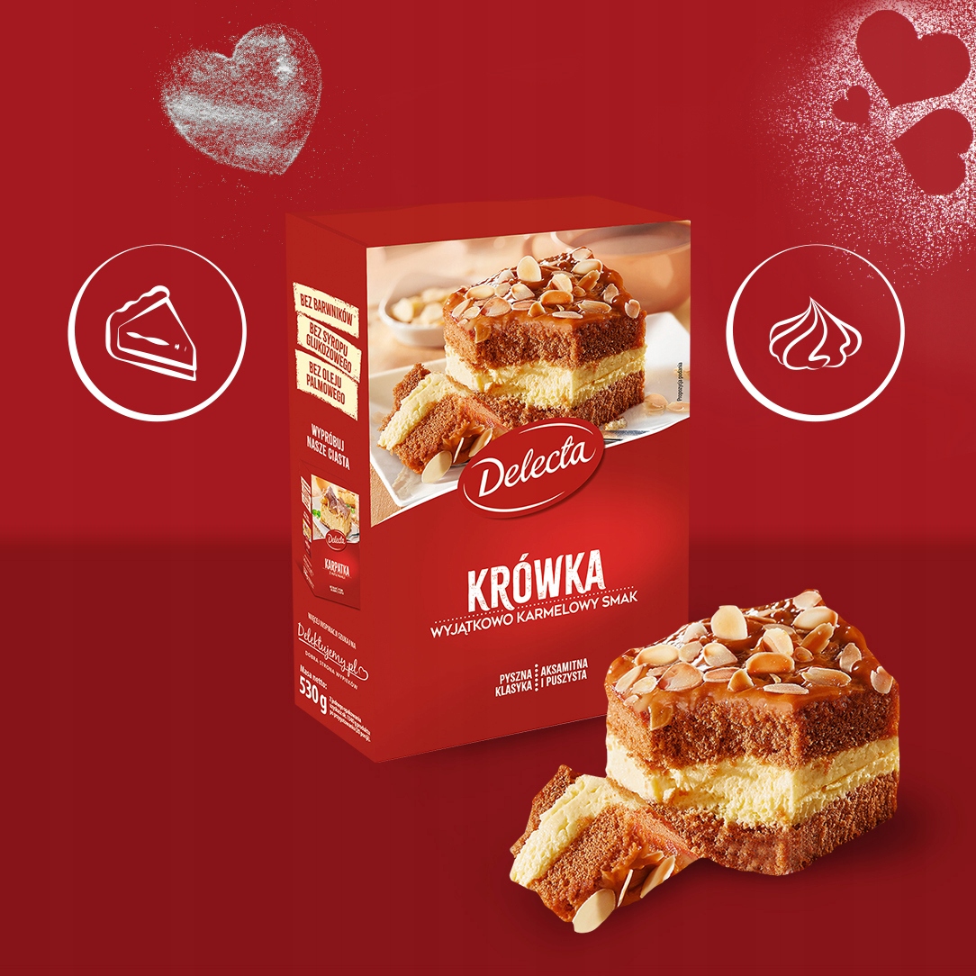Jedno z ulubionych ciast w Polsce ciasto Krówka. N rynku dostępne od ponad 20 lat. Inspirowane lubianymi przez wszystkich cukierkami – krówkami ciągutkami. Miodowo-korzenne ciasto z waniliowym kremem i polewą toffi, gości od lat na polskich stołach. Ciasto Krówka zagościło na stałe w naszych domach, polski wypiek na co dzień i od święta. Spróbuj nasze wyjątkowo karmelowe ciasto Krówka koniecznie, a na pewno polecisz je swoim znajomym. Ciasto Krówka to gotowa, idealnie odmierzona mieszanka do przygotowania domowego ciasta. Udany efekt za każdym razem gwarantuje marka Delecta. Ciasto Krówka możesz wzbogacić orzechami czy płatkami migdałów. Z jednego opakowania ciasta Krówka przygotujesz duża blachę ciasta. Dodaj tylko podstawowe składniki dostępne w każdym domu. Piecz śmiało dla innych...ot tak... prosto z serca. ATRYBUTY: • Idealnie dobrane składniki • Kompletny zestaw – mieszanka do przygotowania ciasta, kremu oraz polewy • Wydajna porcja na dużą blachę • Gwarancja udanego efektu od marki Delecta