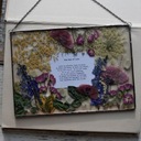 Ten piękny witraż łączy w sobie rozmaite suszone kwiaty, które delikatnie oplatają wydrukowany tekst.