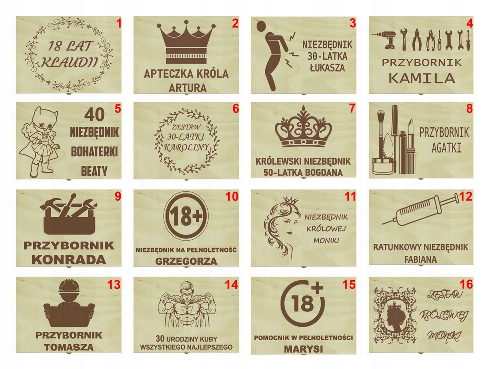 PONIŻEJ PREZENTUJEMY DOSTĘPNE WZORY, MAMY MOŻLIWOŚĆ PERSONALIZACJI ZEWNĘTRZNEJ GRAFIKI PUDEŁKA I TABLICZKI W ŚRODKU