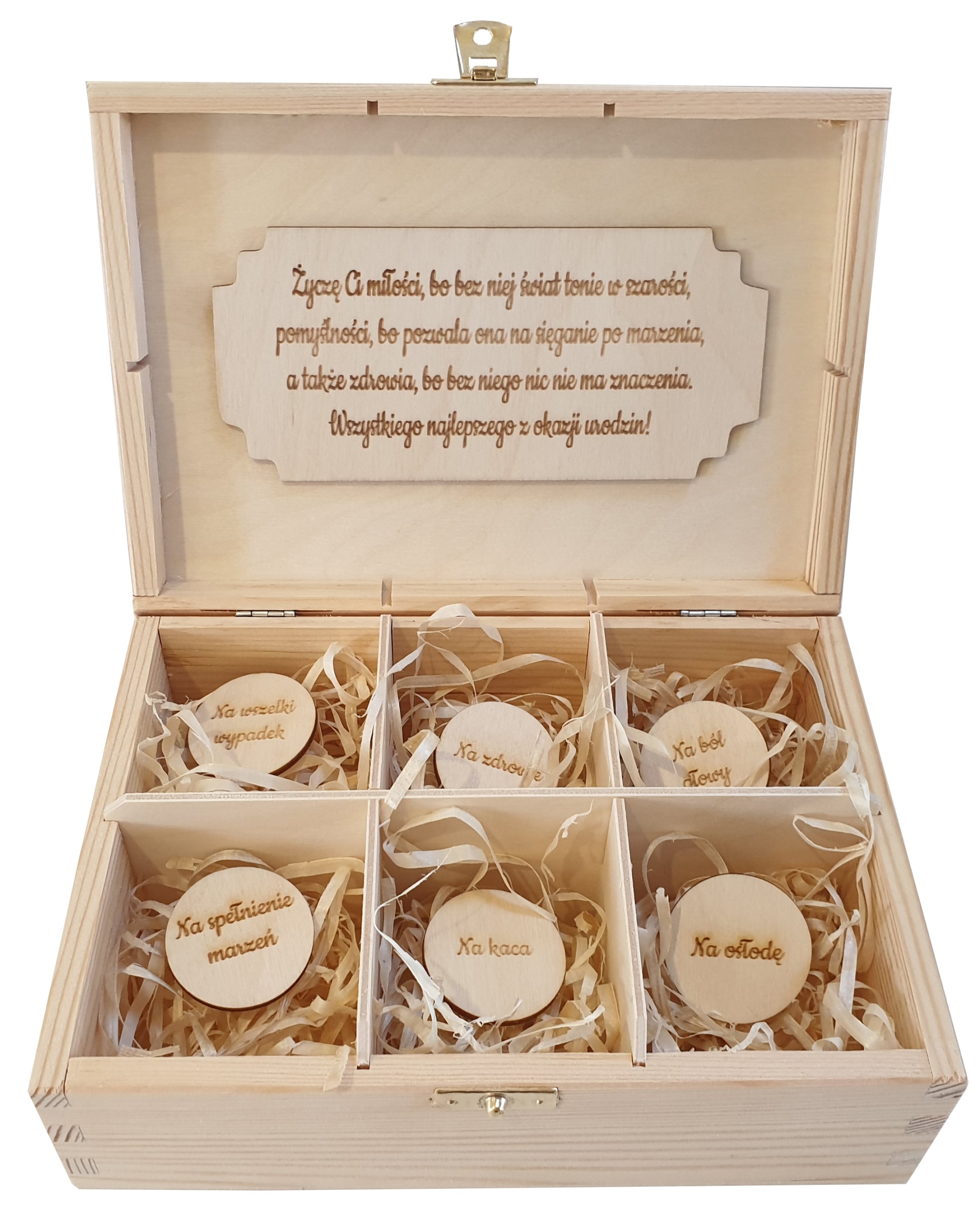 Pudełko z sześcioma komorami z zapięciem. Całość wykonana z drewna sosnowego oraz sklejki. Przegrody można wyciągnąć.