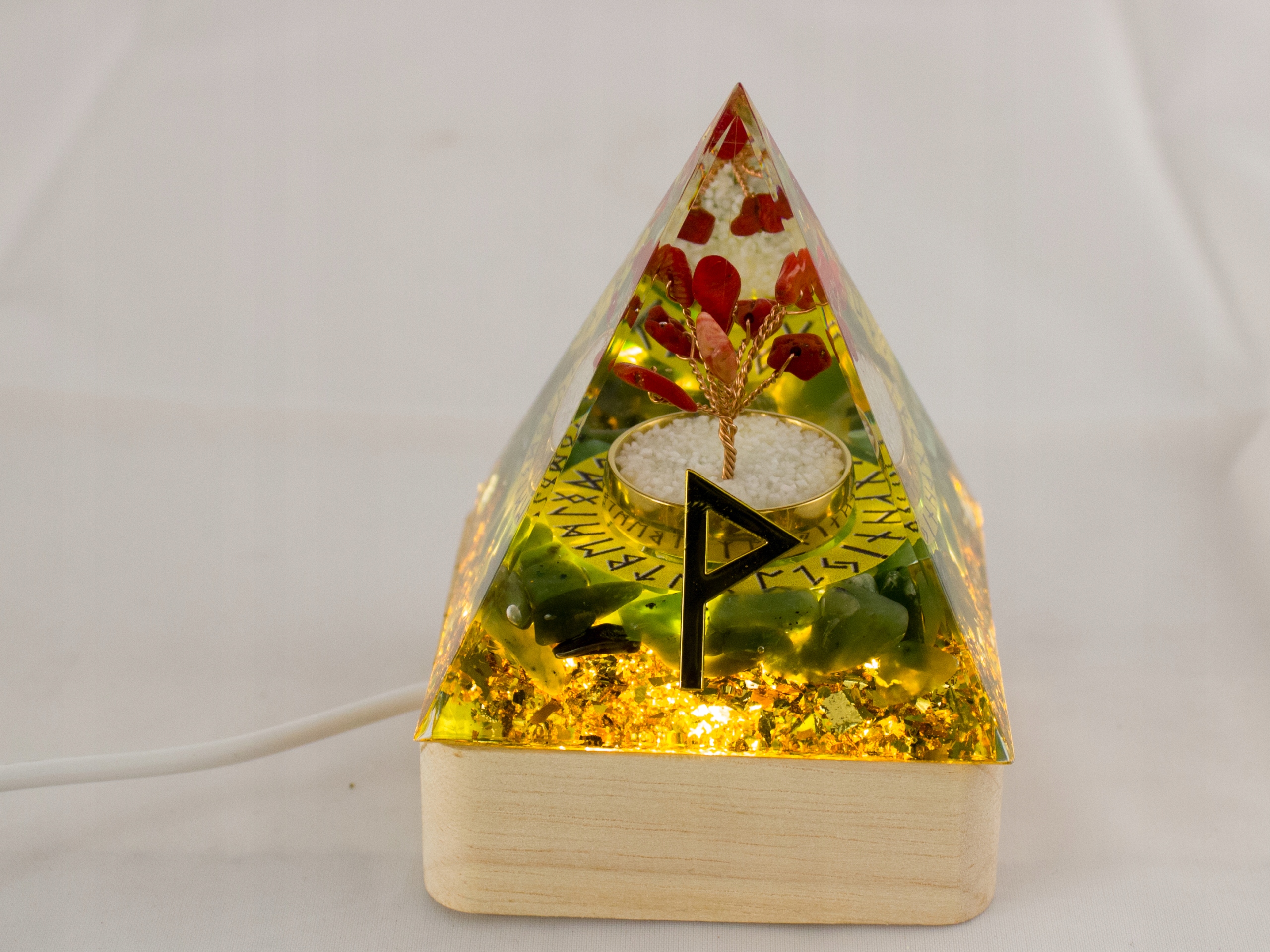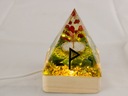 Podstawka została wyposażona w praktyczne oświetlenie LED o ciepłym, przyjemnym świetle. Dzięki temu Twoja piramidka nie tylko będzie wyglądać zachwycająco, ale również stworzy nastrojową atmosferę w Twoim pomieszczeniu.