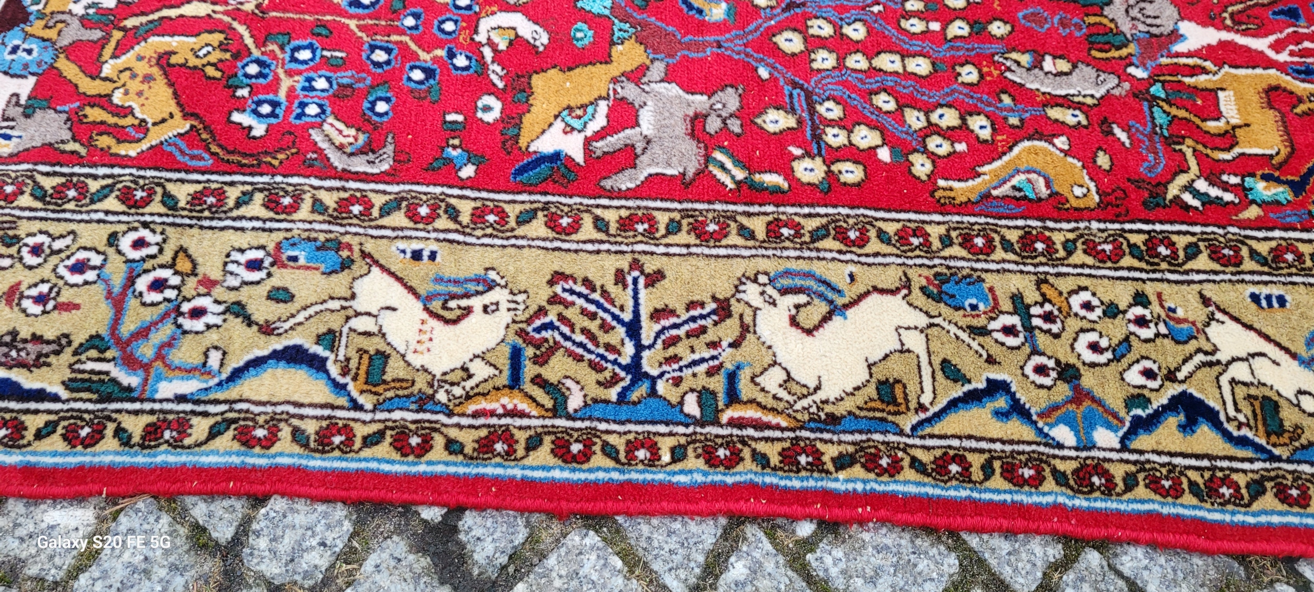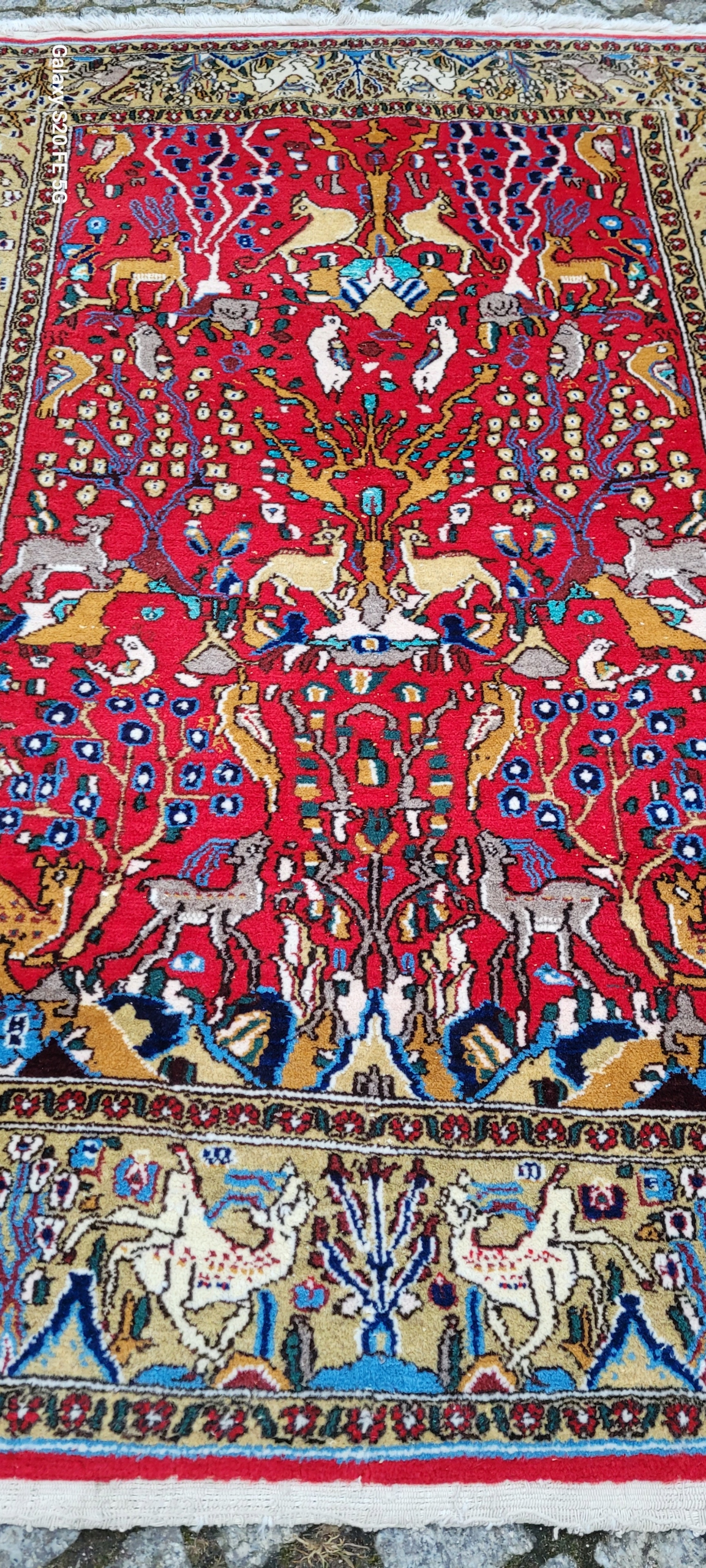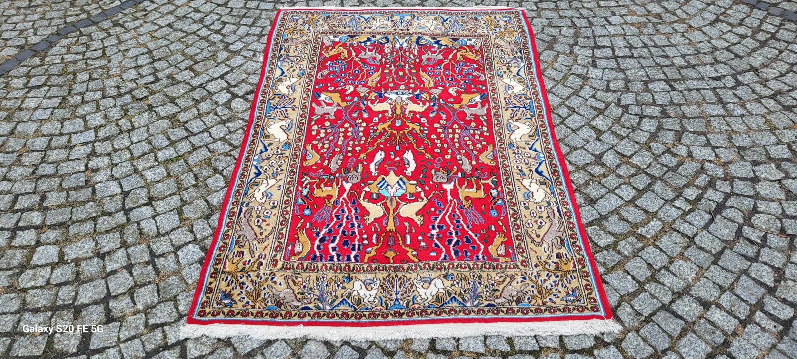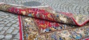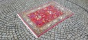 Perski dywan Ghom. Tkany ręcznie z najwyższej jakości wełny. Charakteryzuje się zwartym, przyjemnym w dotyku, lśniącym runem oraz piękną kolorystyką i wzornictwem. Jest zachowany w stanie bardzo dobrym minus, widocznym na zdjęciach.