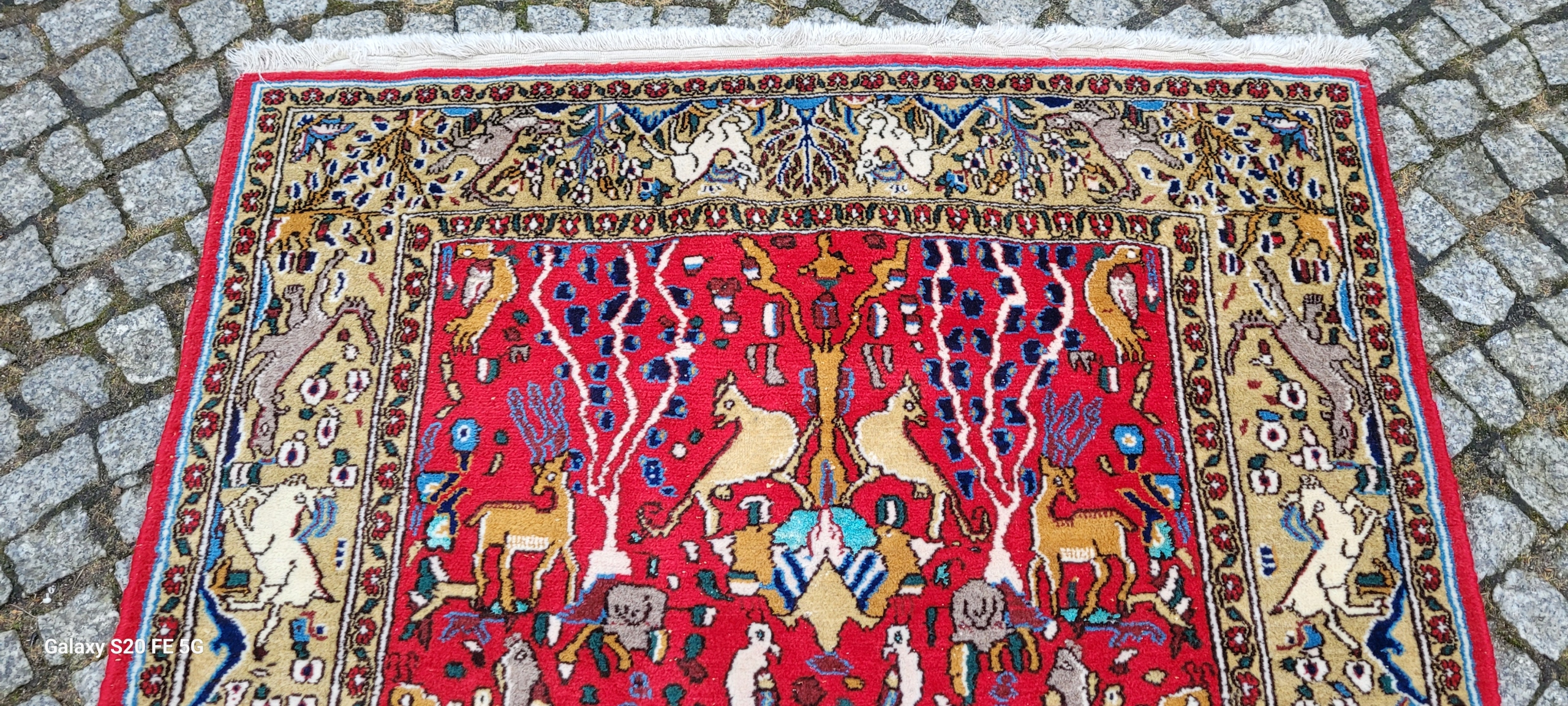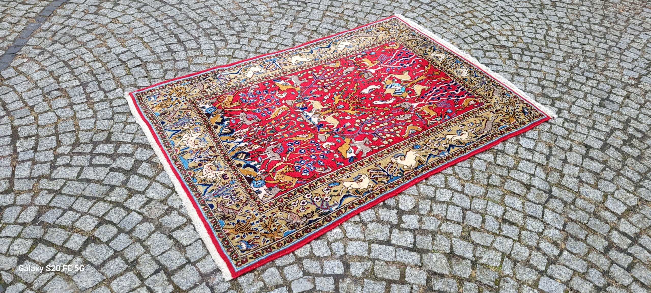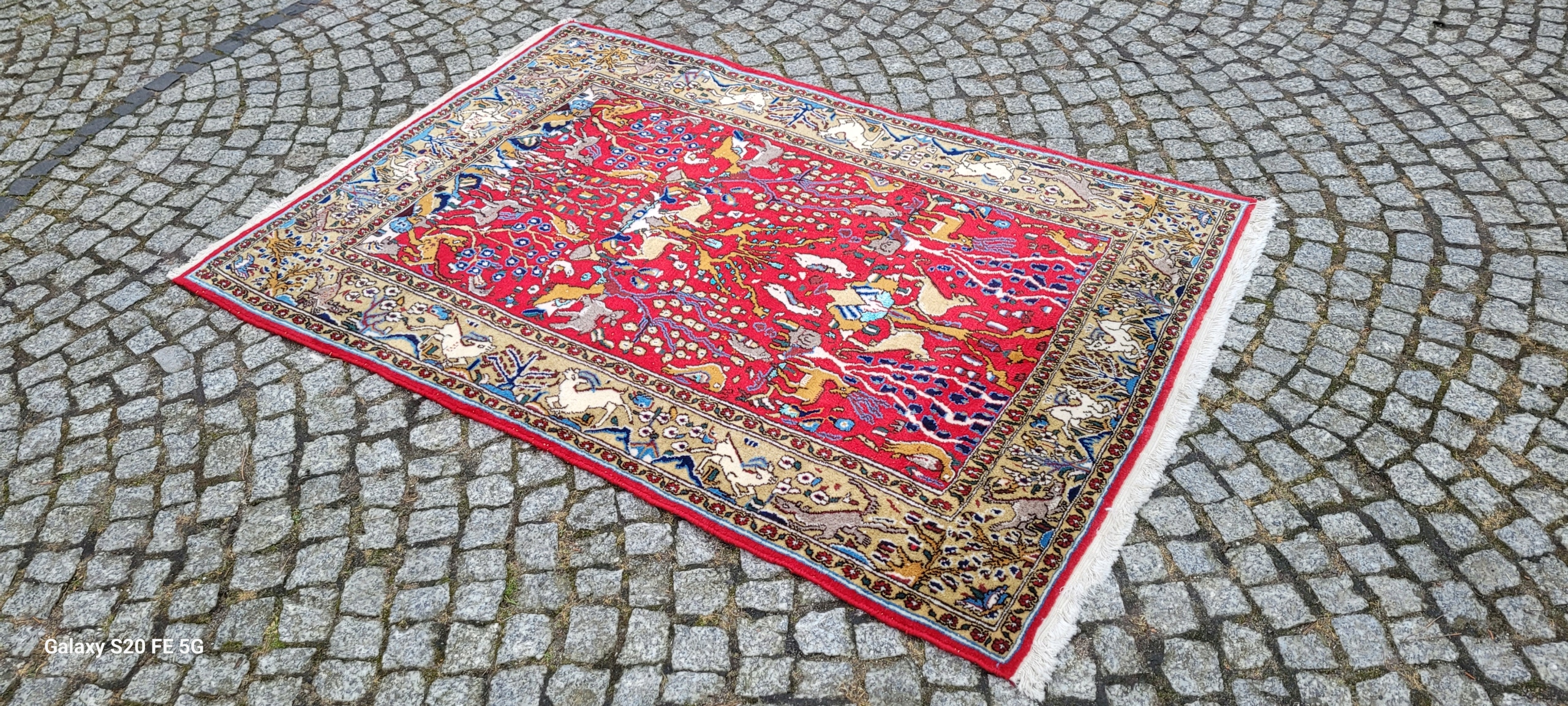 Perski dywan Ghom. Tkany ręcznie z najwyższej jakości wełny. Charakteryzuje się zwartym, przyjemnym w dotyku, lśniącym runem oraz piękną kolorystyką i wzornictwem. Jest zachowany w stanie bardzo dobrym minus, widocznym na zdjęciach.