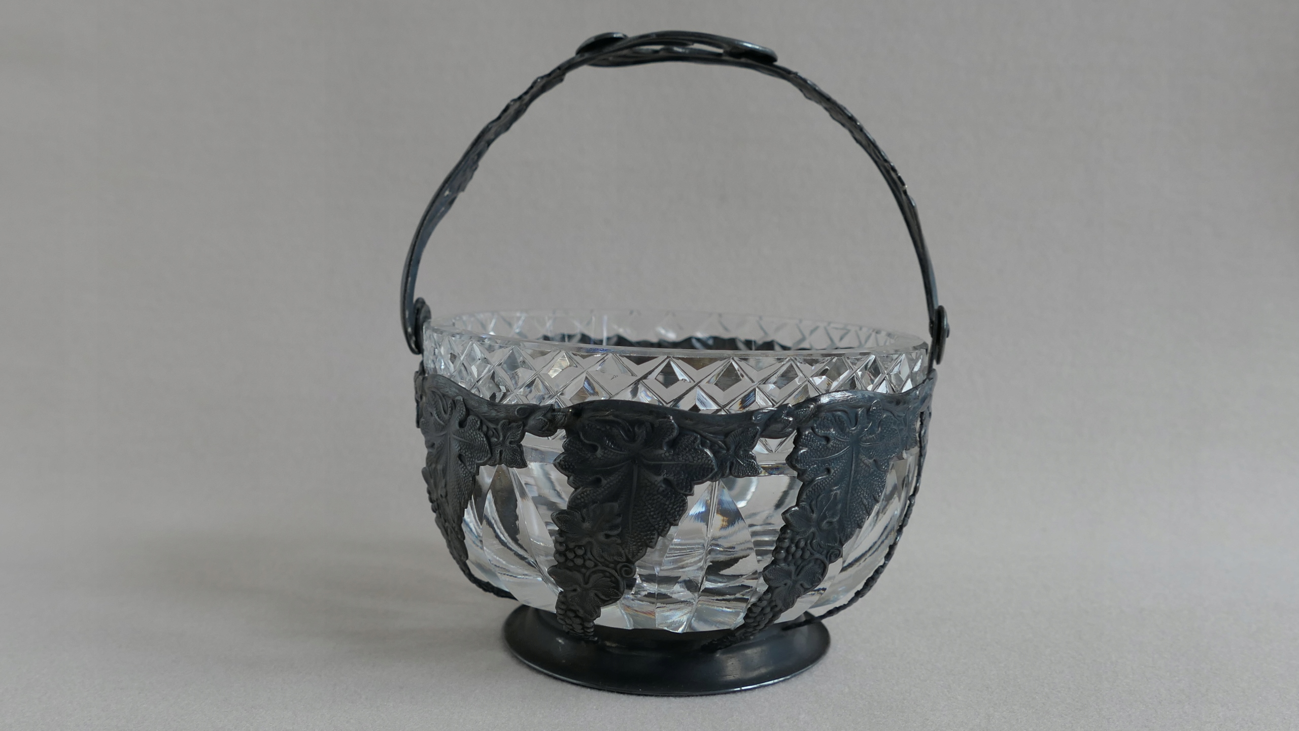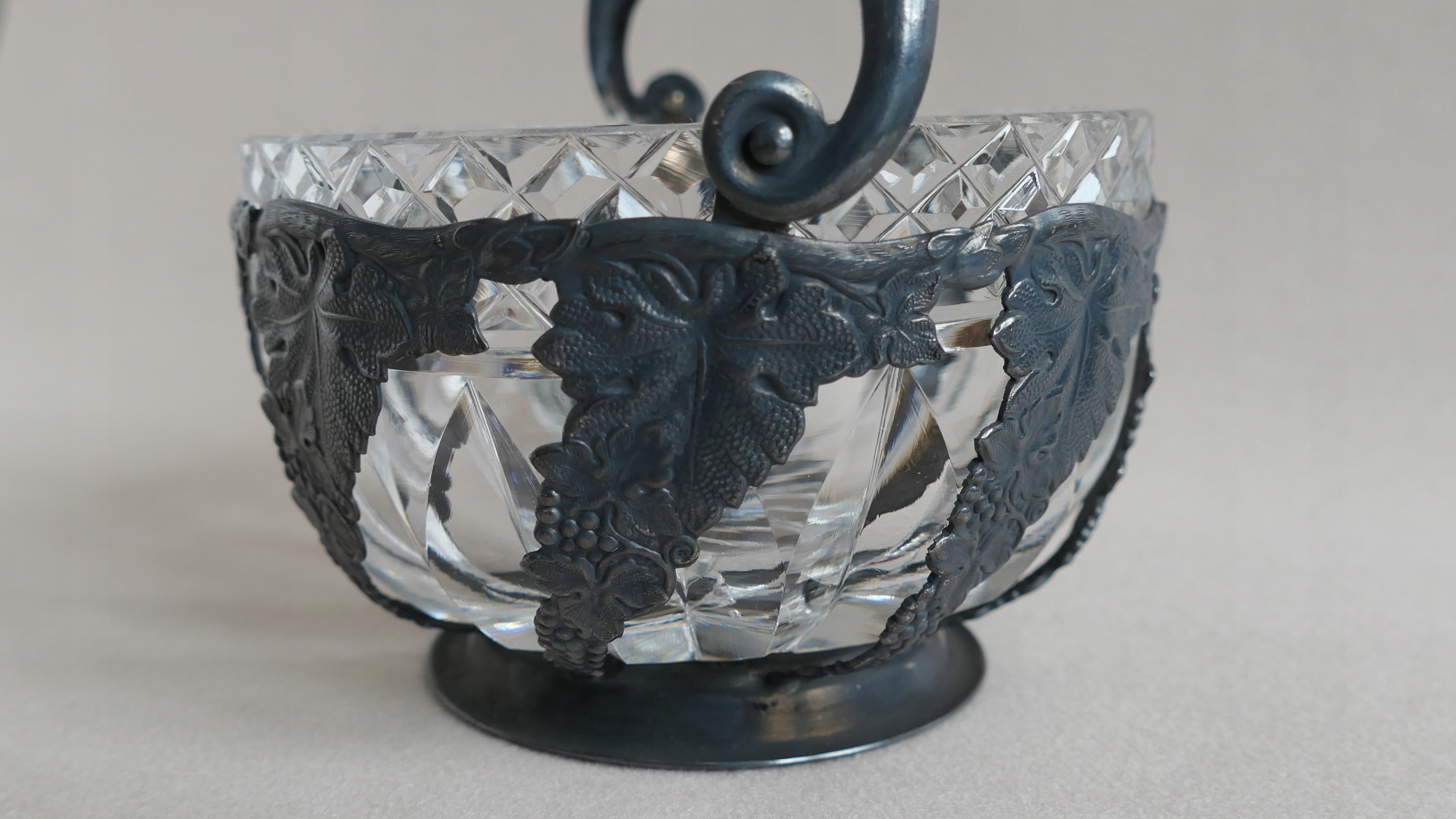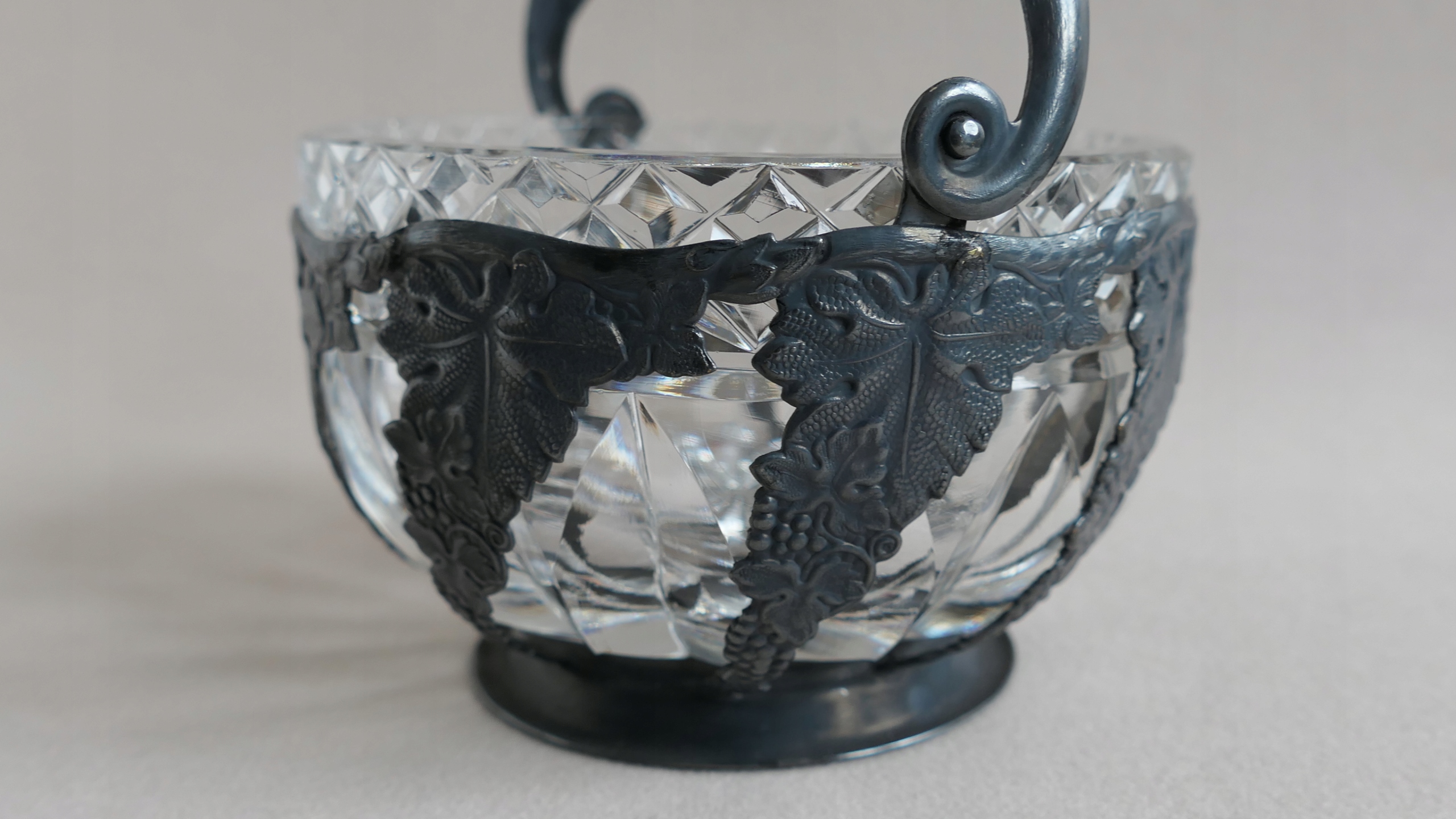 HEFRA cukiernica plater + kryształ PRL WINOGRONA. Wysokość: 14/ 7,5cm, średnica: 11,5cm. Stan bardzo dobry, widoczny na zdjęciach.