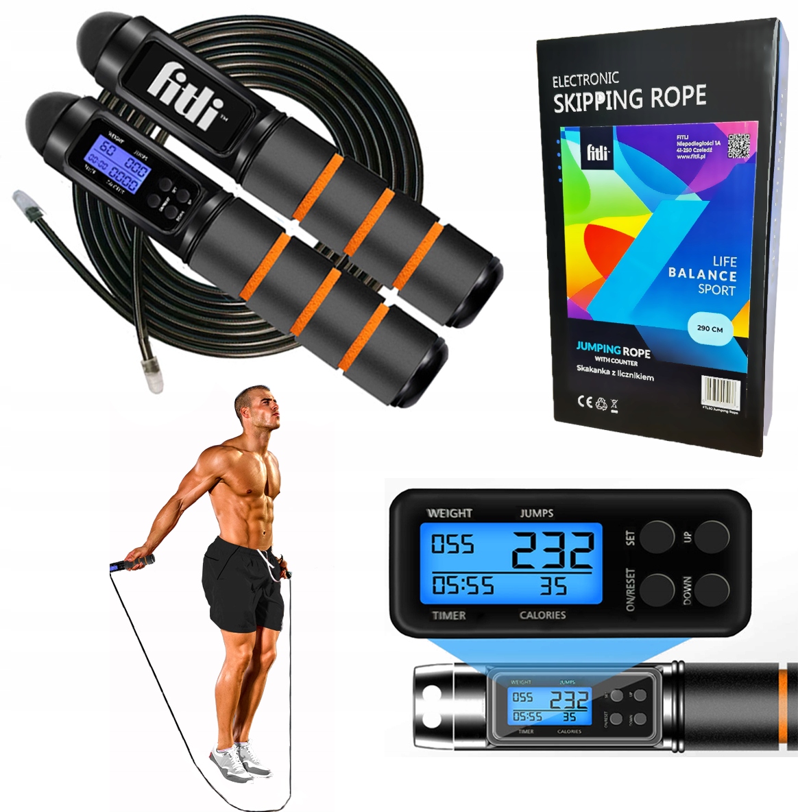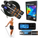 Wyświetlacz LCD wskazuje: ustawioną wagę, czas treningu, a także liczbę skoków oraz ilość spalonych kalorii