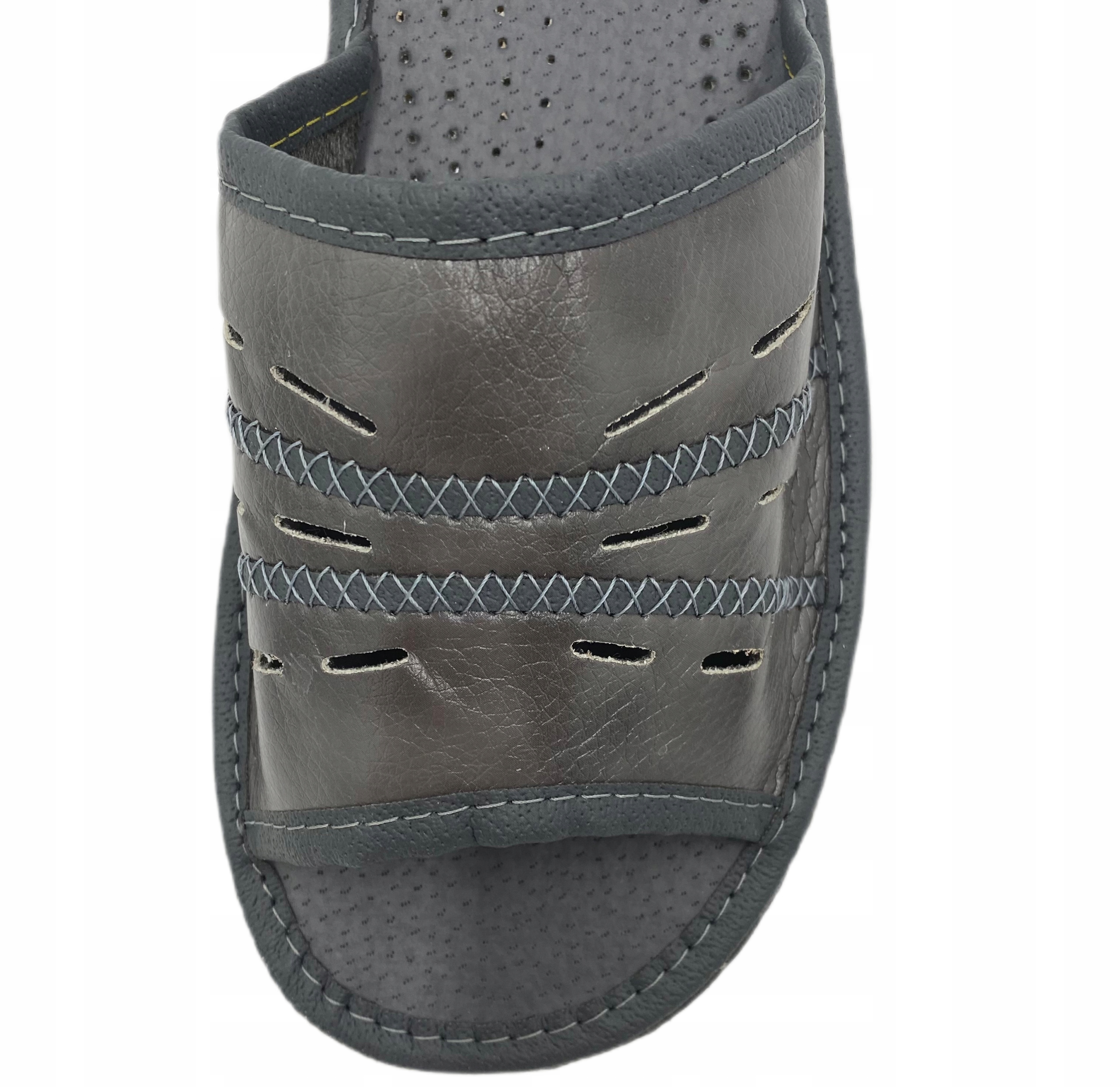 Odkryte pantofle ażurowe z ozdobnymi przeszyciami.
