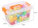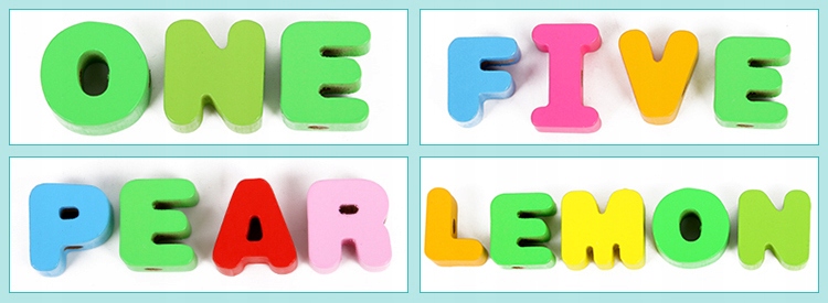 Zestaw składa się z kolorowych, estetycznie wykonanych drewnianych elementów, m.in: literek, zwierzątek, pojazdów, owoców i warzyw.