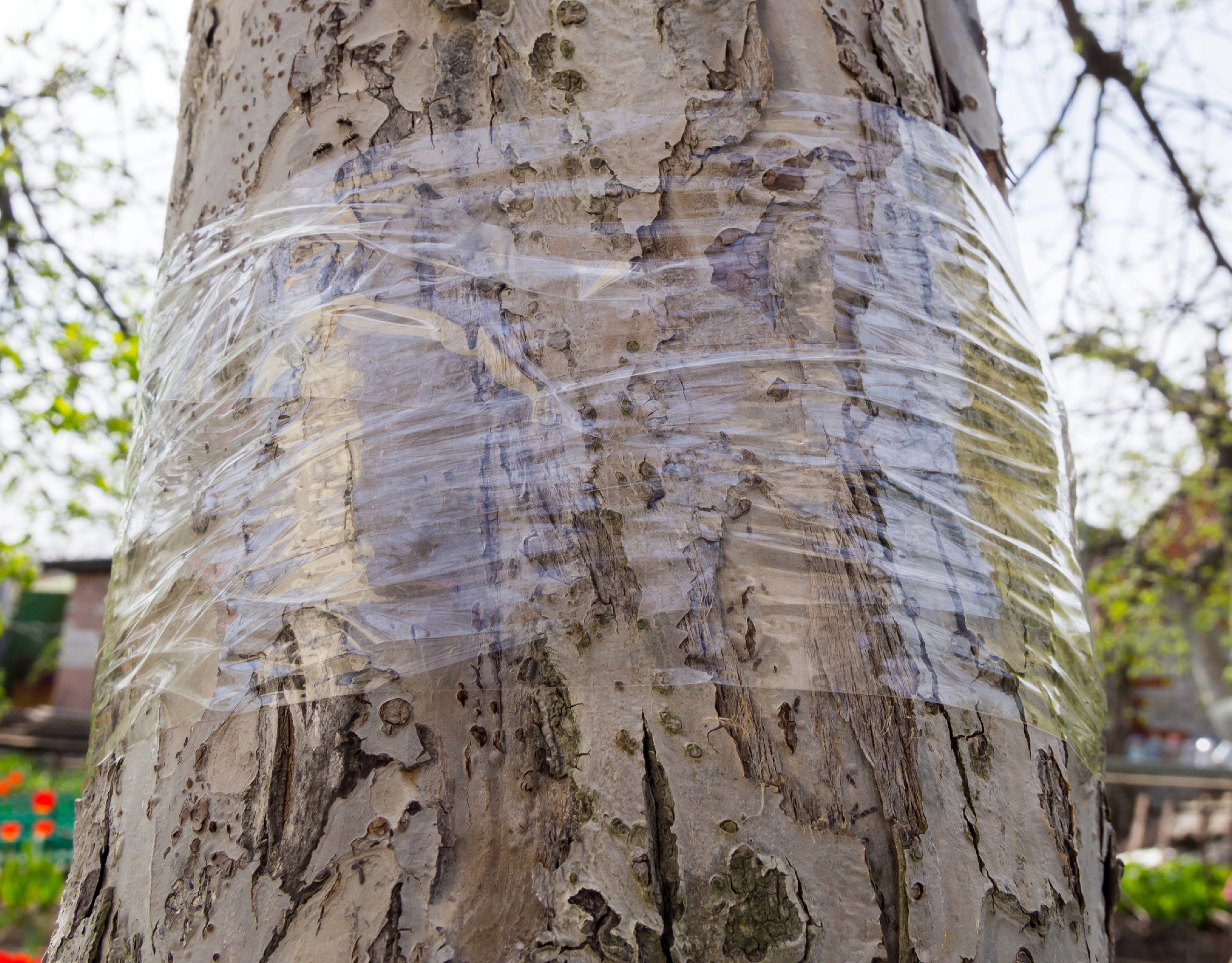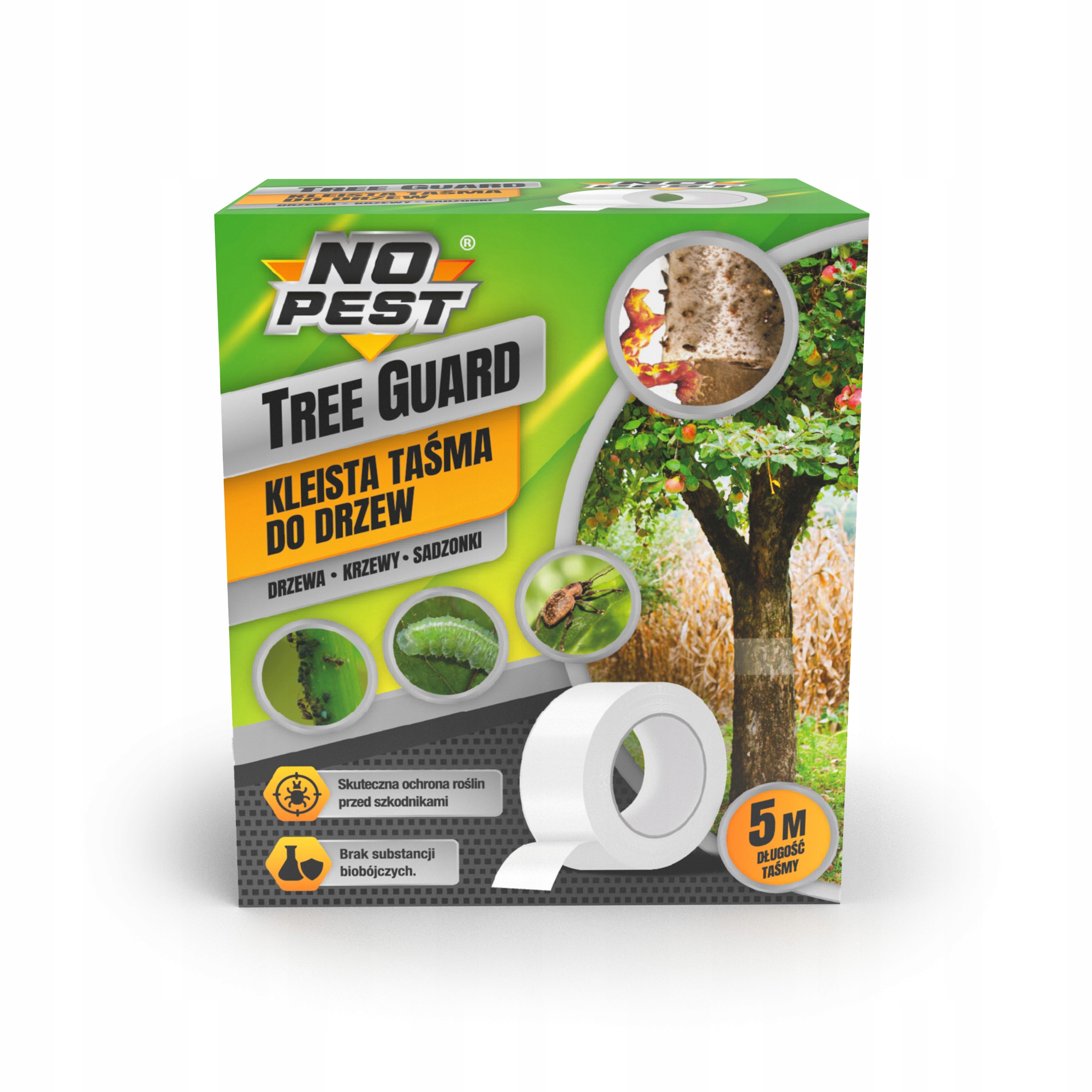 Zamocowana na pniu roślin taśma klejąca Tree Guard NO PEST powstrzymuje dorosłe owady i larwy wędrujące po pniu przed dotarciem do liści, zapobiegając przed ich niszczycielskim żerowaniem, ratując drzewa i plony.