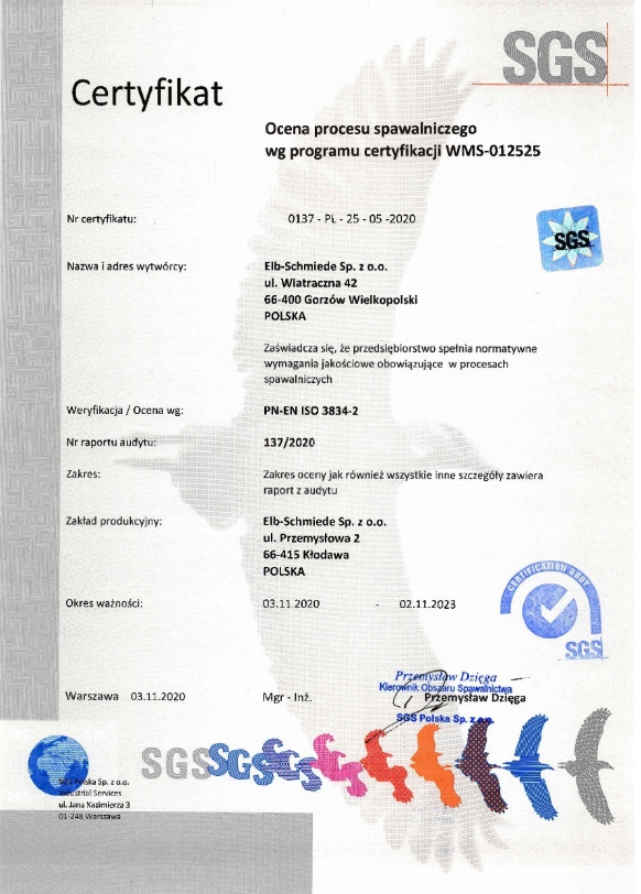 Nasze kompetencje zostały potwierdzone przez audytora jednostki certyfikującej SGS Polska (certyfikat numer 2525-CPR-PL20/1456) zaś procesy spawalnicze zostały potwierdzone w trakcie audytu SGS Polska, certyfikatem na zgodność z normą en ISO 3834-2.
