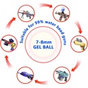 Istnieje doskonałe uzupełnienie pistoletu na kulki. Po moczeniu w wodzie przez cztery godziny średnica żelowych perełek będzie stale wzrastać do 7-8 mm, co jest kompatybilne z kilkoma blasterami z kulkami wodnymi. Szybka strzelanka daje dzieciom lub dorosłym ekscytujące wrażenia. Nadaje się do bitew drużynowych i członków rodziny.