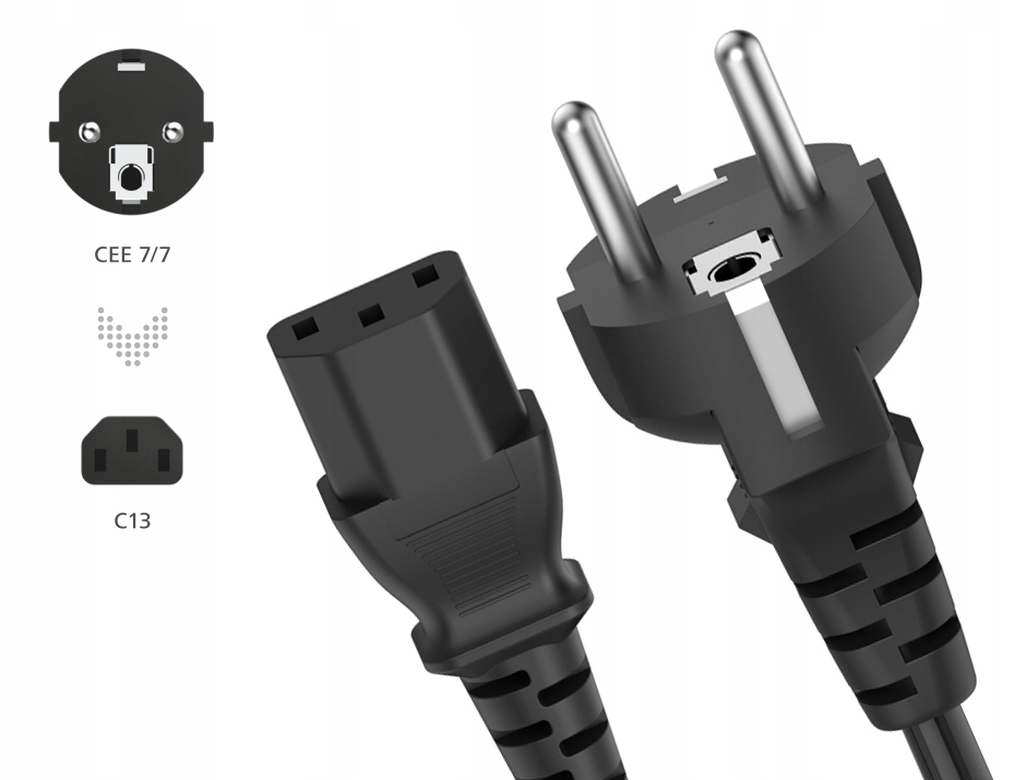 Solidne wtyczki oraz gotowe uchwyty kablowe, odporne na działanie mechaniczne. Zastosowanie elastycznych materiałów zapewnia ochronę przed złamaniem kabla. Do podłączenia komputera, monitora, drukarki lub skanera ze złączem IEC do zasilania. Idealny jako zamiennik dla krótkich, długich lub uszkodzonych oryginalnych kabli IEC. Odpowiedni do wielu urządzeń elektrycznych / multimedialnych. Odporny, wytrzymały kabel. Testowany przez VDE. Przekrój żyły przewodu 0,75 mm². Liczba żył 3. Maks. wydajność połączenia 10 A.