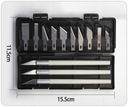 Komplet zawiera trzy wygodne w trzymaniu rękojeści do których można zamontować dowolne z 13 ostrzy. Szeroki wybór kształtu i wielkości ostrzy pozwoli na dopasowanie narzędzia do danego zadania.