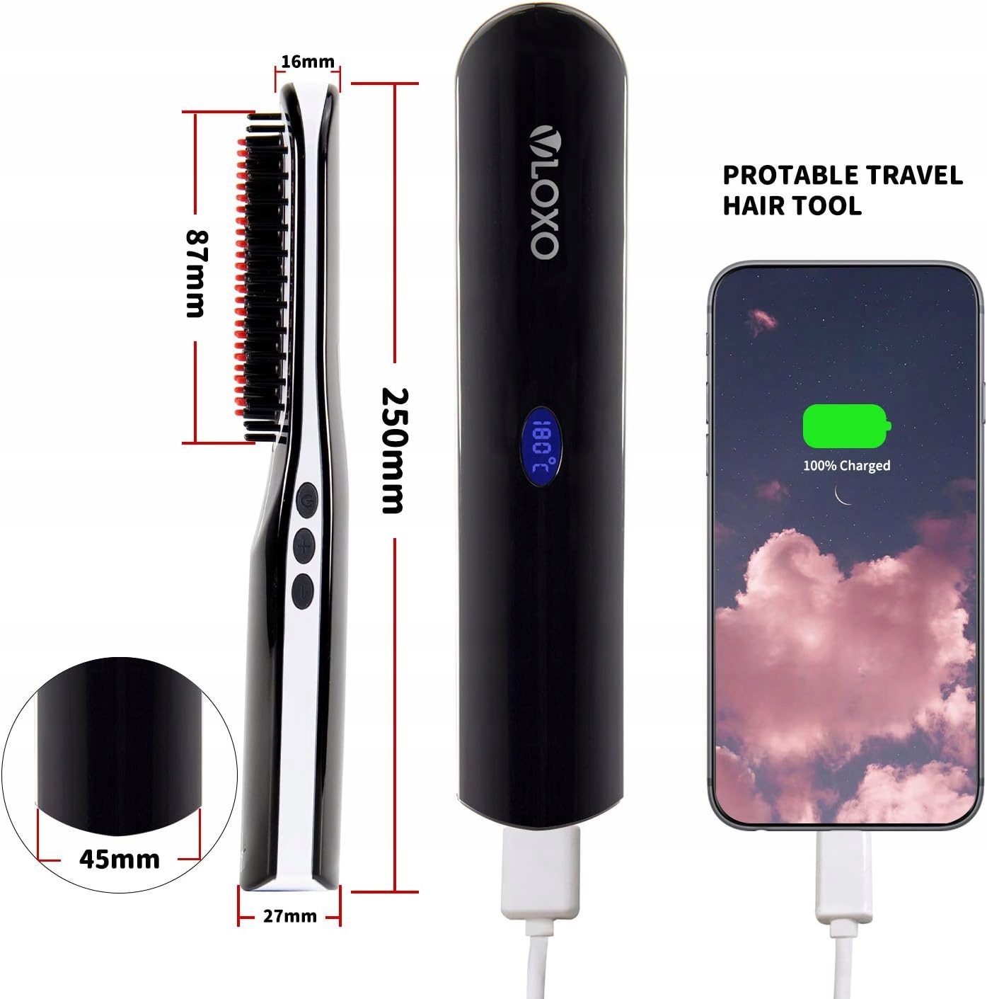 Dzięki bezprzewodowej prostownicy do włosów nie musisz się martwić o plątaninę przewodów. Możliwość ładowania przez USB. Jest lekki, dzięki czemu grzebień można używać wszędzie. Na przykład: podróże, dom, impreza, biuro, na świeżym powietrzu itd. (Automatyczne wyłączanie po 30 minutach ciągłej pracy, unikanie marnowania energii i bezpieczeństwa. Funkcja blokady temperatury sprawia, że temperatura nie wzrasta i chroni włosy przed uszkodzeniem)